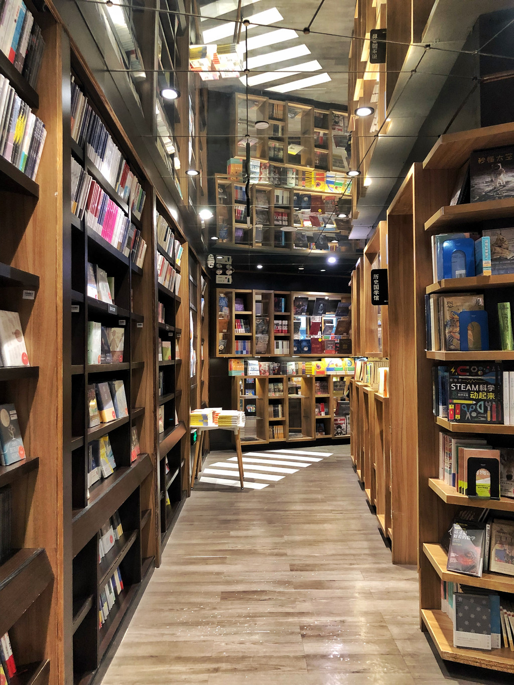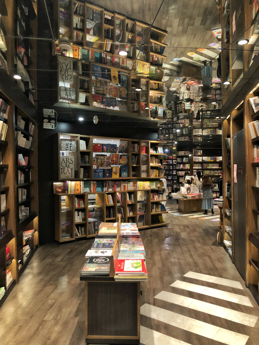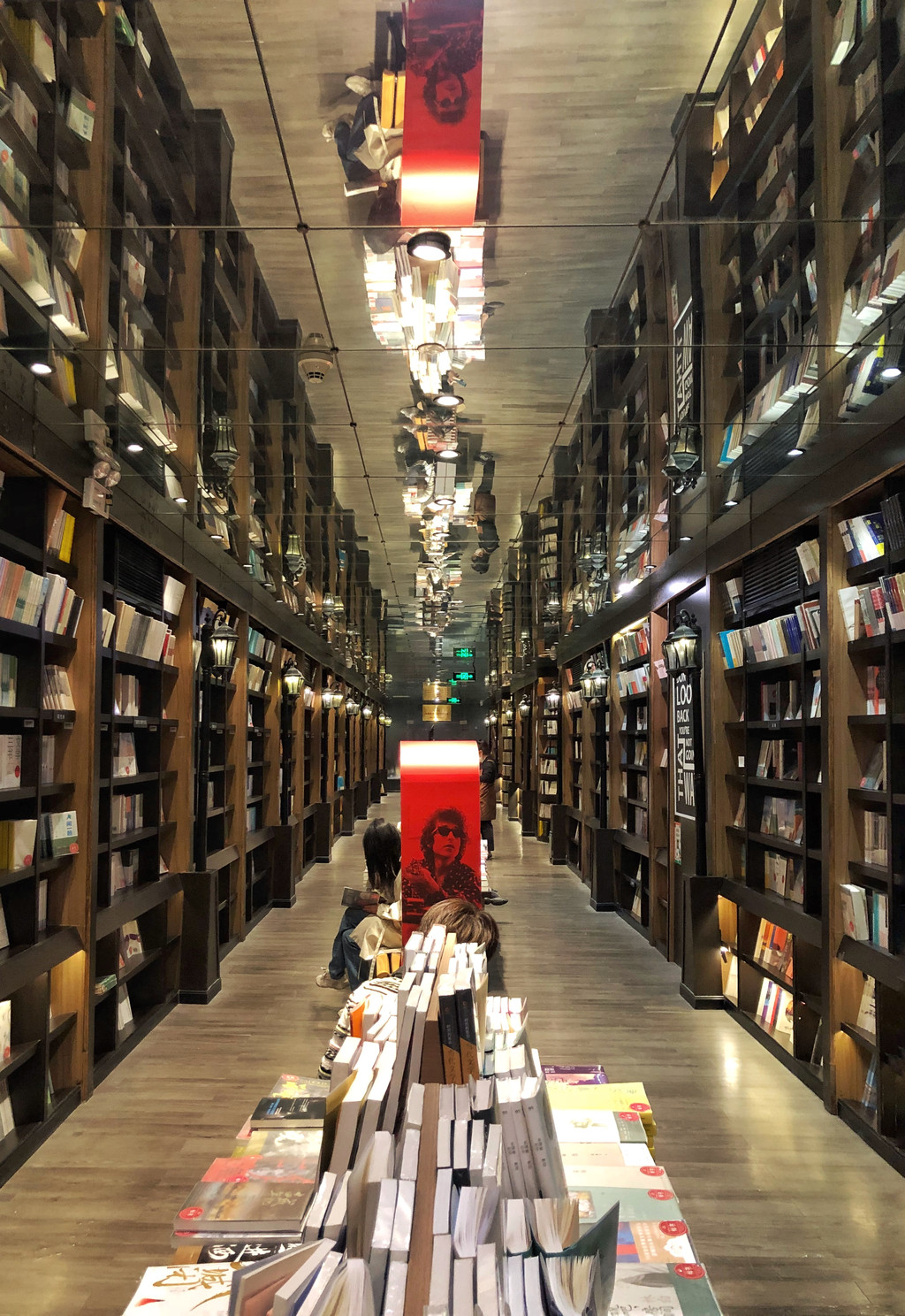 巧妙运用镜面,真是美得让人错乱,在这里拍照都会有一种空间错落的美感,仿若置身于“盗梦空间”。书架林立在两侧构成了巨大的书籍长廊,就像一条无限延长的路,给人强力的震撼感。