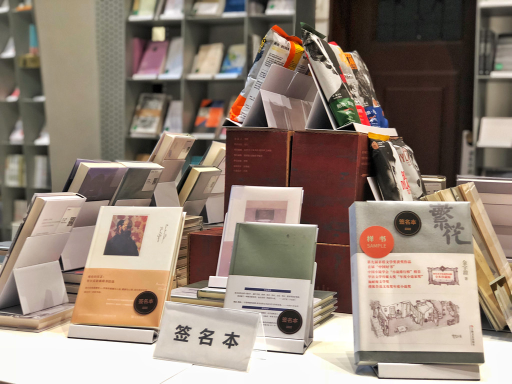 这里书架上藏着很多作家的签名本。在书架上多淘淘翻翻,很可能就能买到一本珍贵签名作品。