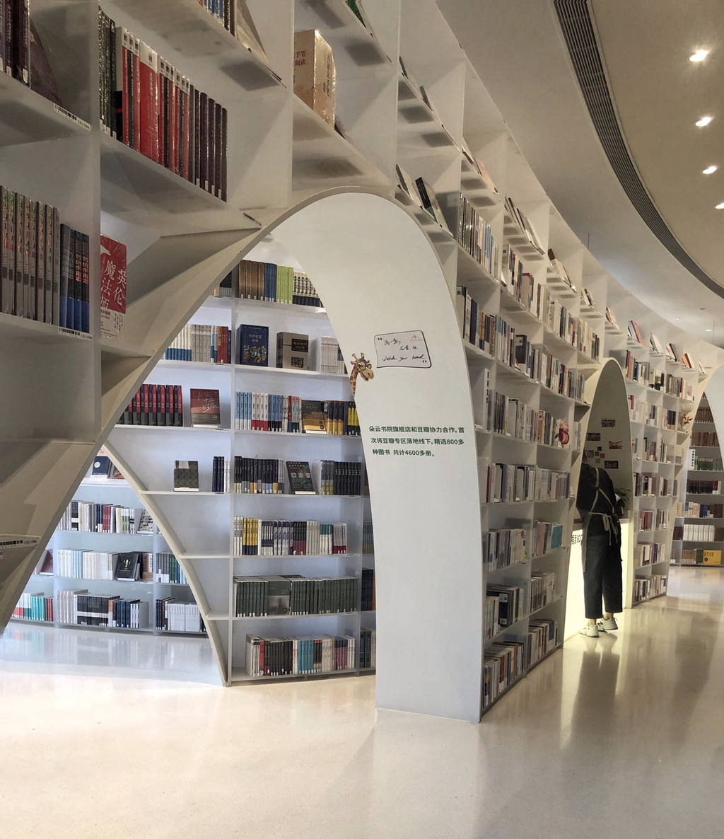 进入朵云书院旗舰店,首先遇见的便是“山水”,清新自然的白色区域,用无数个连续的落地书架构成一个个连绵的书洞,由于书架本身的材质是透明的,一眼望去,确实有种漫步在云端的错觉。