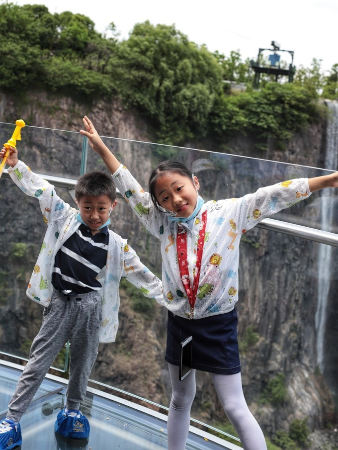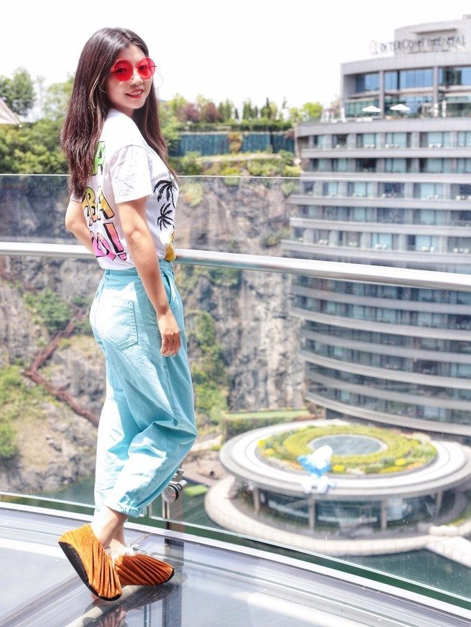 一侧是瀑布奔涌而下的流水声,一侧是玻璃栈道上的人声,只有我们的小蓝精灵安静的坐在酒店露台上向我们招手。我们在玻璃栈道玩了好久,主要是特别适合拍照,还有几个小朋友在这里,玩的不亦乐乎。深坑秘境还有好多其它游乐项目的,但我们花在玻璃栈道上的时间太多了,时间有限,那就等到下次再约上一帮朋友一起去玩了。