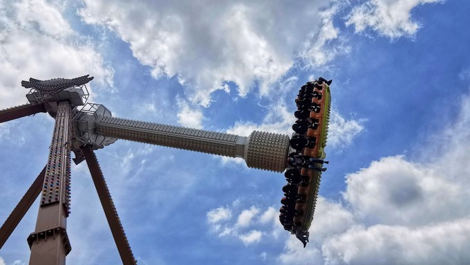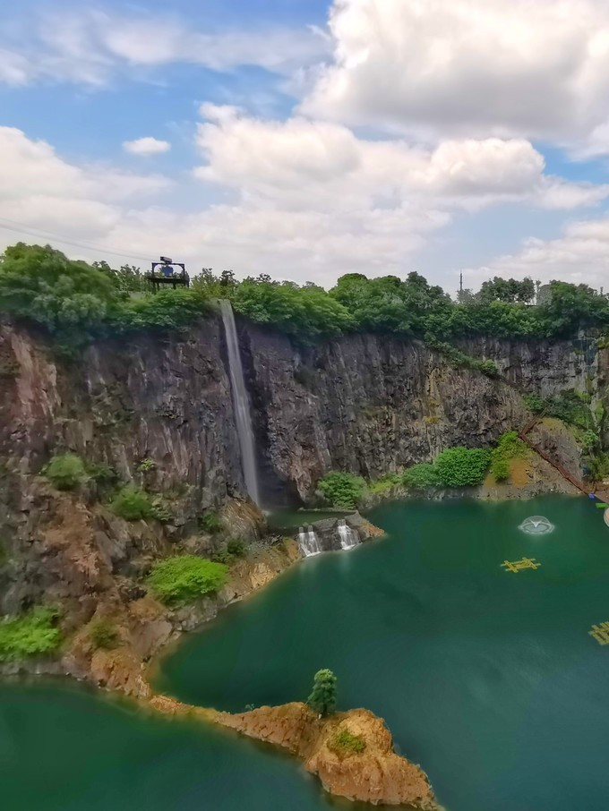 深坑秘境就在酒店旁边,走进大门,大家都迫不及待的去玻璃栈道,希望可以一睹深坑酒店的芳容。但是我们看人多,就先玩了玩玻璃栈道入口处一旁的崖壁飓风,就是传说中的大摆锤,人不多,景区也对人流有限制,所以不用排队就玩到了,好嗨。