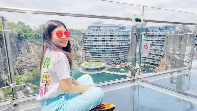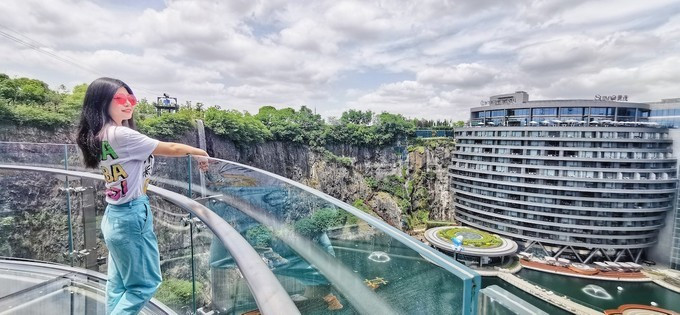 本来还想玩一下飞跃深坑的,可惜当天去的时候在检修,没办法就到了玻璃栈道排队。进入玻璃栈道,深坑酒店和一个巨大的深坑出现在我们眼前,走这个玻璃栈道,是看酒店和深坑的最佳最正的位置。