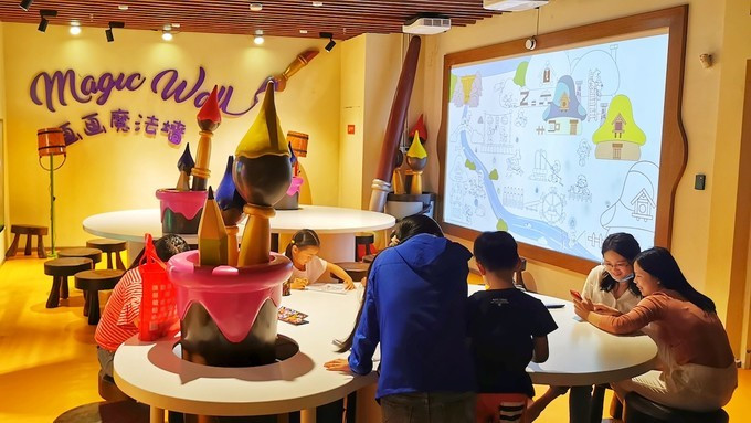 画画魔法刷就比较安静啦,小朋友来到这边可以画画、涂鸦、堆积木,我们还看到有几个小朋友对着一面投影墙拍拍打打,原来这是一个互动的小游戏,投影在墙上,哎,我们小时候怎么没有这些好玩的东西。