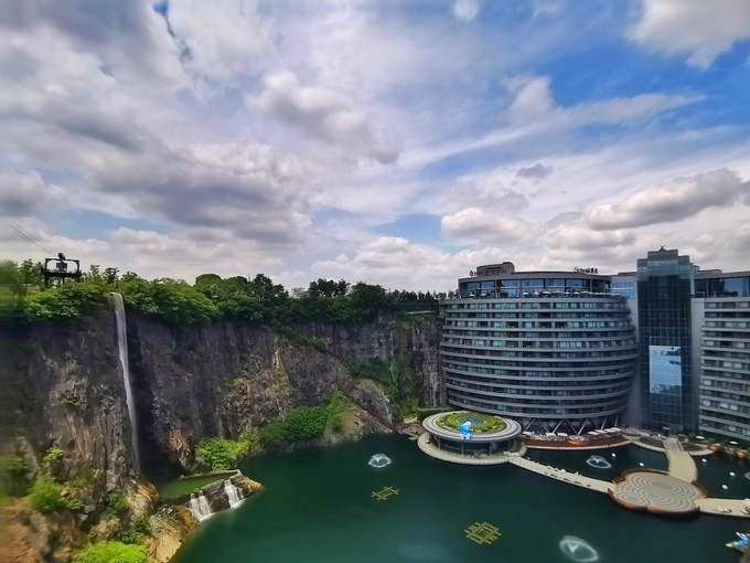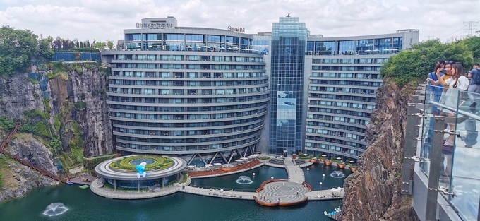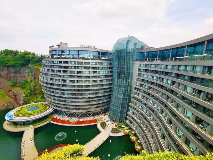 深坑酒店的全称是 上海 佘山世茂洲际酒店,酒店最网红的部分就是它的建筑设计了,整个酒店下探地表88米开拓建筑空间,依附深坑崖壁而建,被 美国 国家地理誉为“世界十大建筑奇观之一”。