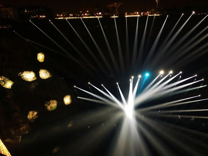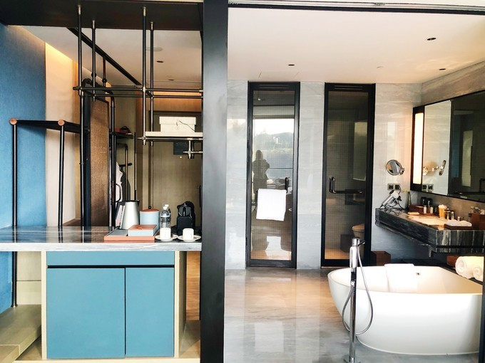 我们入住的是深坑酒店的岩石景观房,房间布置简约却又不失设计感,走上阳台就能看到深坑的美景了,心旷神怡,晚上的时候酒店还安排了灯光秀,射灯打出来,整个酒店好像成为了一座超科技感的大舞台,流光溢彩。