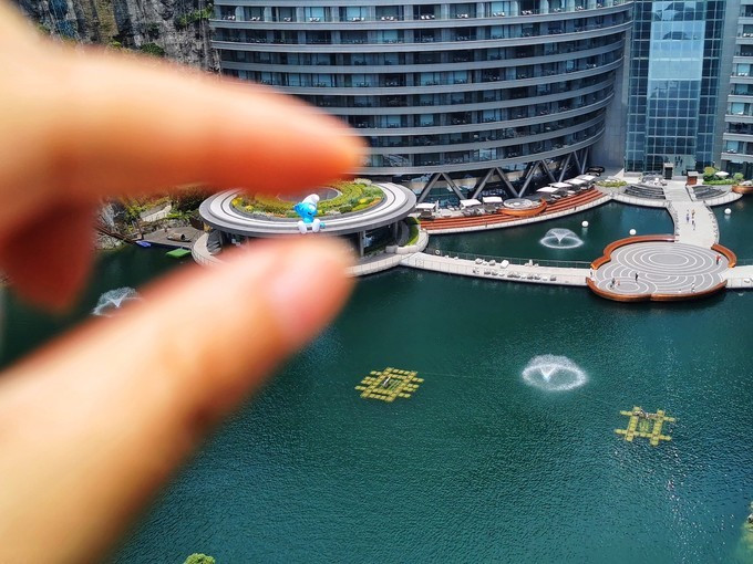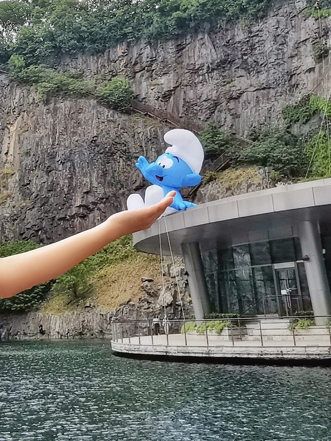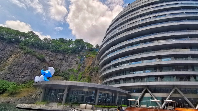 闲来无聊去酒店底层打卡,从下而上感受整个深坑的伟岸,有趣的是我们居然在酒店也邂逅巨型蓝精灵气模,我们又走不动路了,在这里一阵狂拍照。