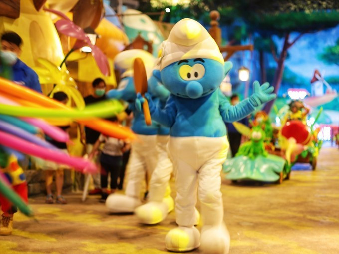 运气好如我们,一进来蓝精灵区,就碰到了花车巡游,蓝精灵动画里的角色正向我们走来,好多小朋友都忍不住上去求合影。