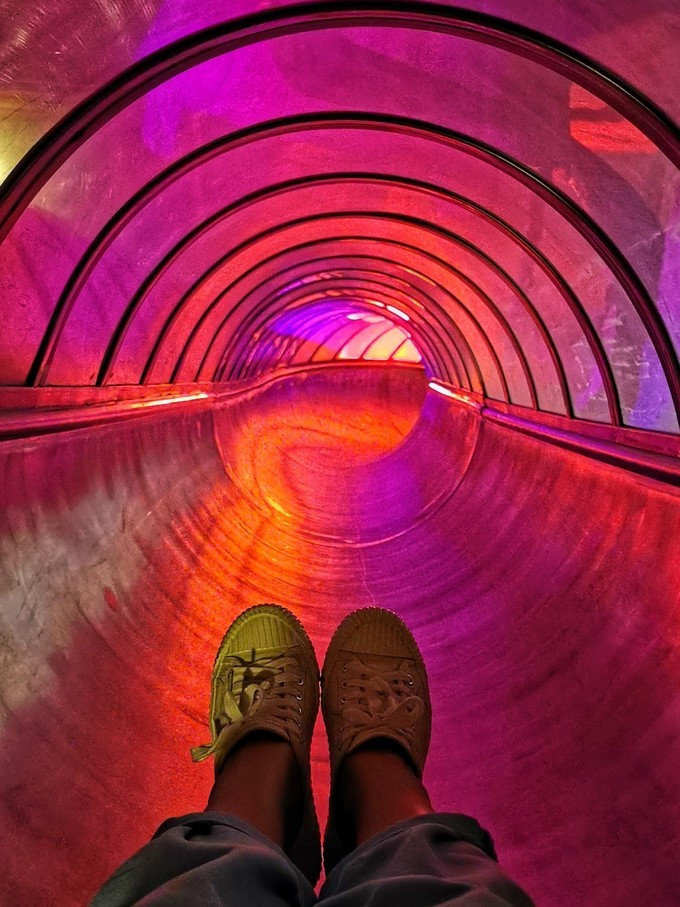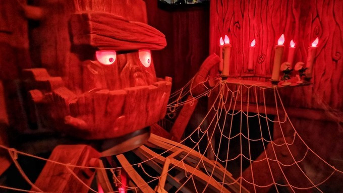 走过蘑菇屋,就来到了黑暗实验室,这可是格格巫的领地,本以为里面可能会很害怕,有点像鬼屋的感觉,但工作人员说不怕的,我们就排队走进去,真的一点都不害怕,里面通过场景和音效的设计,还原了蓝精灵动画里大反派们的领地,也蛮有意思的,最后坐着滑梯下来,好玩。