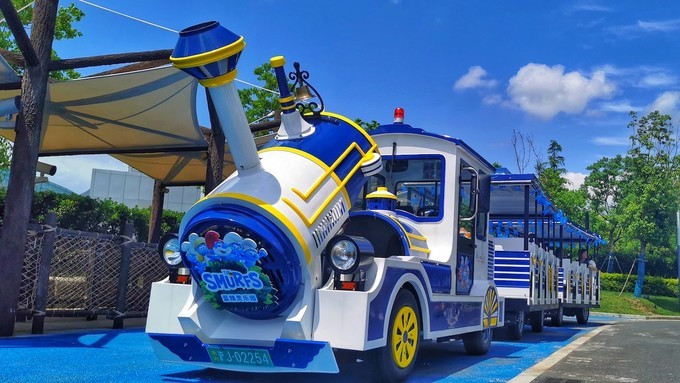 连接深坑秘境和蓝精灵乐园的是一条幽静的小路,景区的小火车就从这里经过,但是个人认为如果天不热的话,走一走也蛮舒服的,看着如高原一般的魔都天空,天是蓝的,蓝精灵是蓝的,我也是蓝的。
