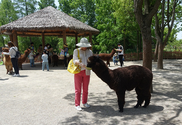 羊驼吃的是草,友情提示进去后不要摸他们的屁股,一进去就有个羊驼冲着我手里的草奔走过来了,然后快速的吃起来了,挪开小箩筐它就跟过来,想甩开它那是办不到的,直到里面的草全部给它消灭掉为止,呵呵~~