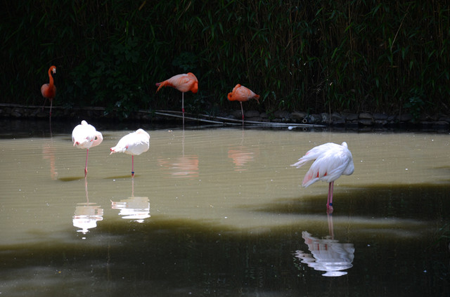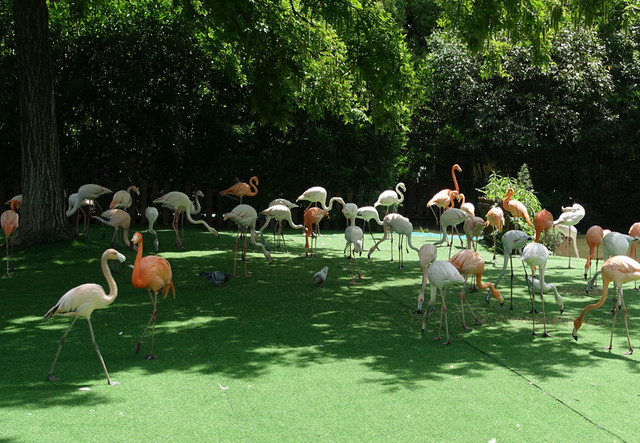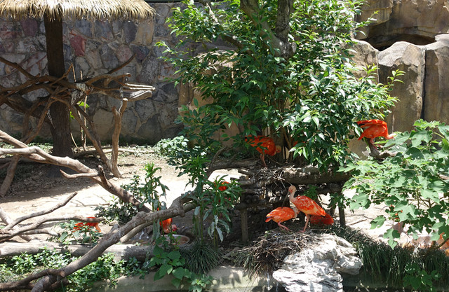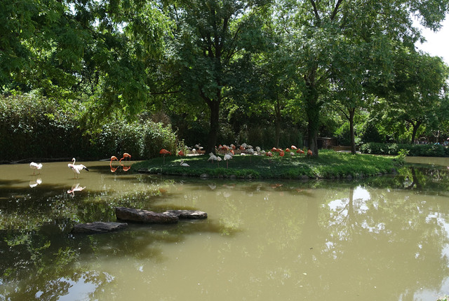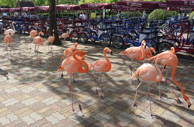来之前做了点功课,第一站入园直行左拐直奔车入区,但是在这档口遇到了一个小惊喜,正好遇到工作人员带领了一队火烈鸟队伍往大门口走去,估计是来门口迎宾的吧,可是今天不是周末和节假日呀,哈哈运气真好,赶紧抓拍,来和美丽的火烈鸟来个零距离接触,非常开心~~因为要赶着去车入区坐大巴车,所以没有跟着可爱的动物走太远。