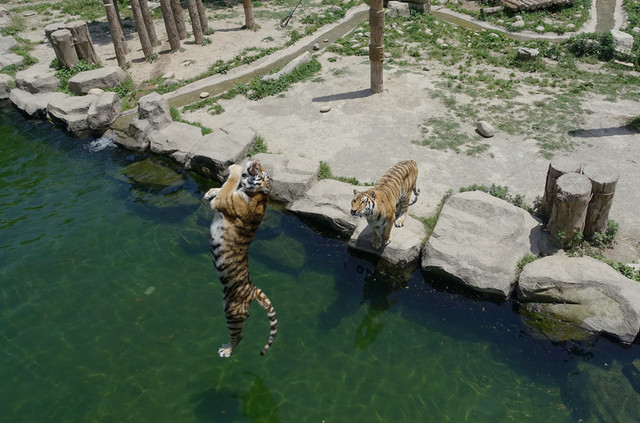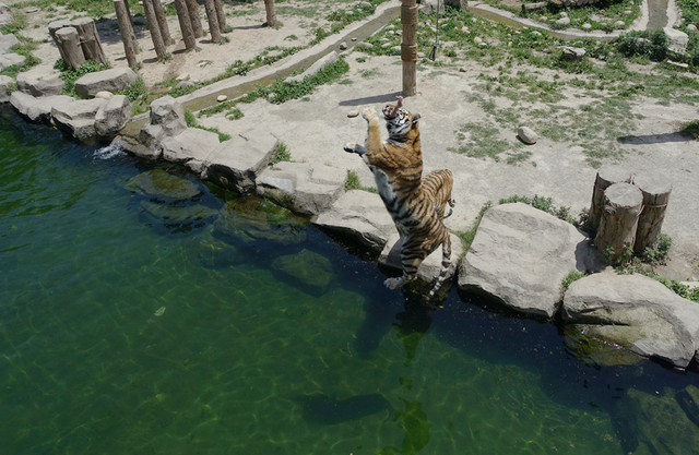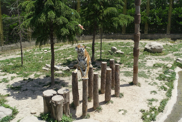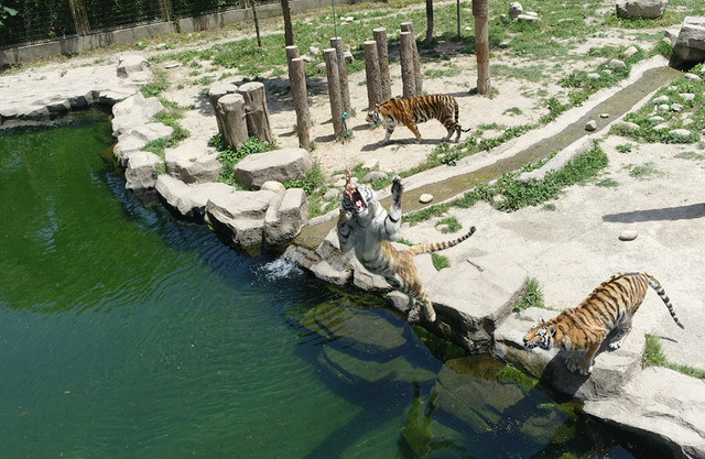 老虎扑食携程上预订了门票16元/人,就可以登上2层观看表演,不买门票的就在底层观看,有玻璃隔开的,玻璃擦得也挺干净也能看的比较清楚。老虎在扑食扑空的时候,在2层都能清晰地听到老虎牙齿咬合的声音,可见用了多大的劲,真的被它咬伤一口,是多么惨烈啊!