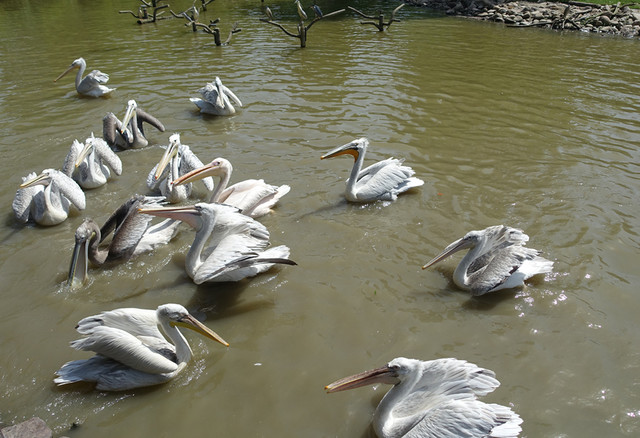 这边鹈鹕的讲解已近尾声,讲解员把桶里剩下的食物一下子都倒入了湖中,引来了鹈鹕们的纷纷抢夺。