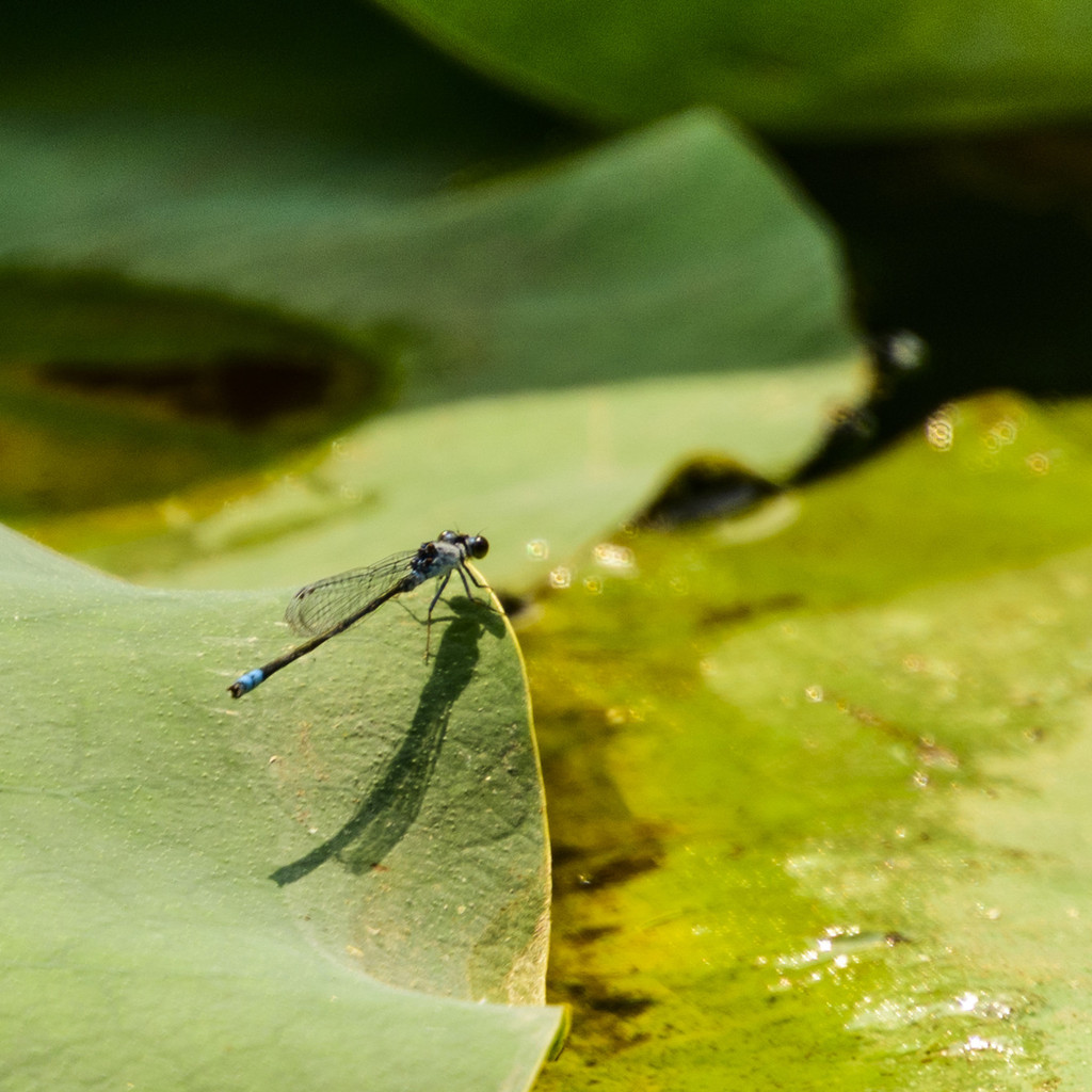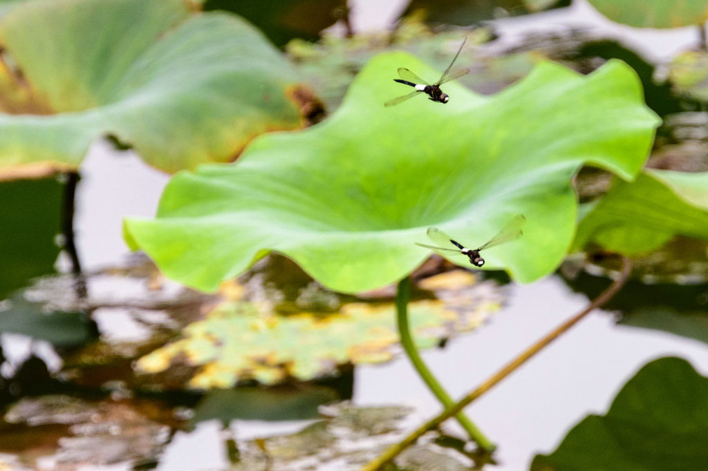 荷塘还有豆娘,豆娘(Caenagrion)属于昆虫纲,蜻蜓目,束翅亚目,统称蟌(cōng)。体形娇小,休息时翅束于背上方。我国常见的有大和小。身体细长且软弱的飞行昆虫,类似小型的蜻蜓,但不是蜻蜓。