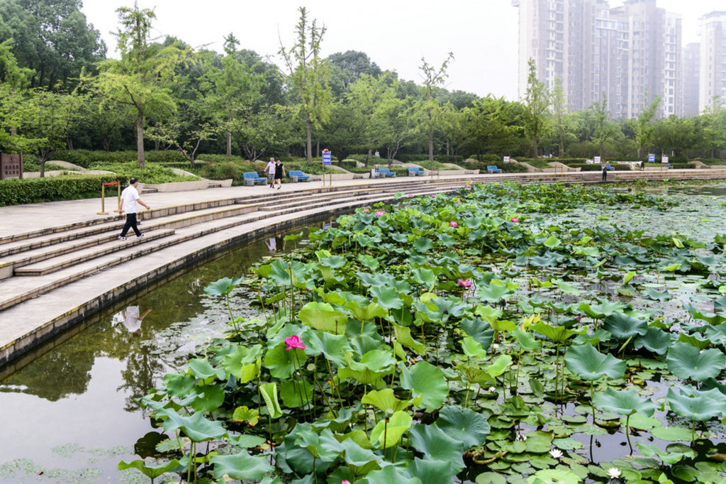 沿着公园正门径直向里走,不远处就能到达荷花盛开的水域,水面比较广,有一圈台阶的亲水平台,环绕湖面形成了优美的半弧。