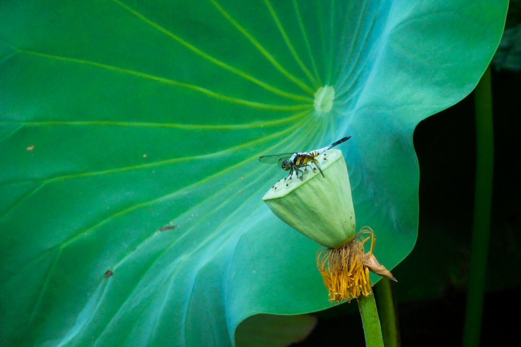 是啊!蜻蜓是荷塘里的舞者。荷是安静的,有了蜻蜓,这凝固的风景便灵动起来。蜻蜓点水,掀起圈圈涟漪。蜻蜓落在荷尖上,荷花轻摇。动与静,奏响了和谐的旋律。蜻蜓的翅膀的红黄与荷叶的绿、荷花的飘逸,映成了一道别样的风景。