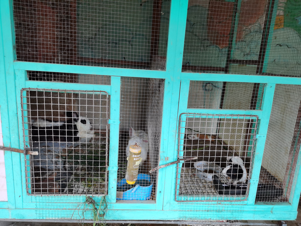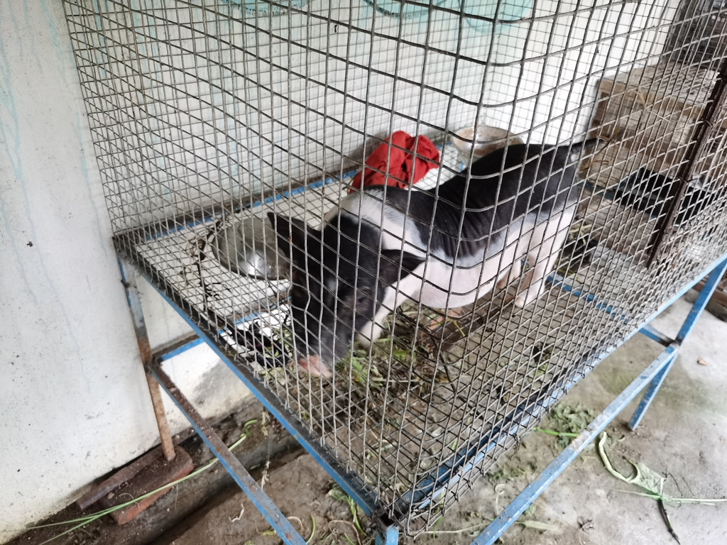 道具猪也辛苦,只能住在铁笼里面,这样地面相对容易清扫,也难为它了。