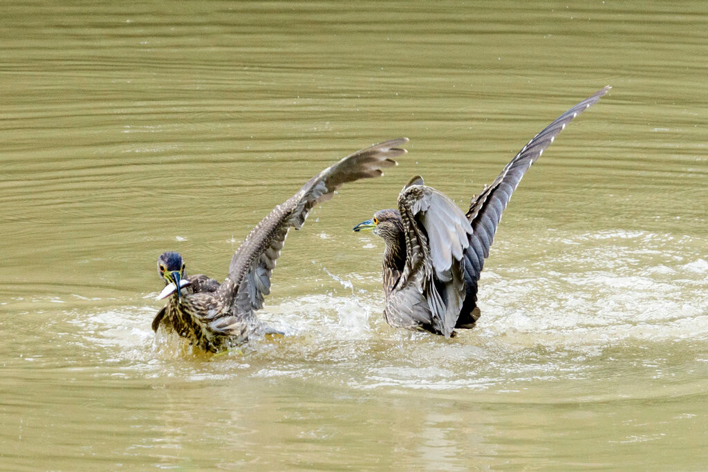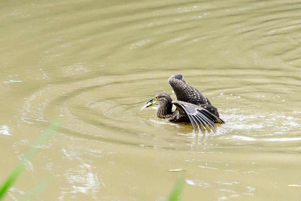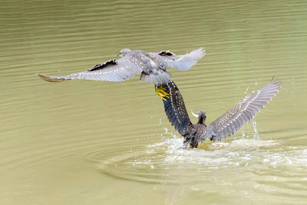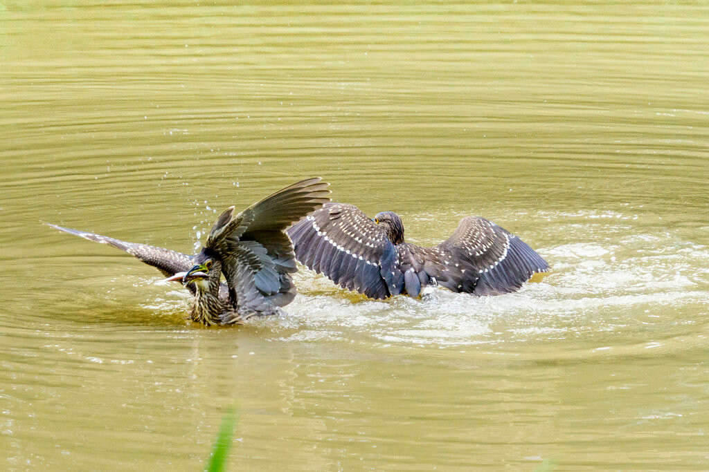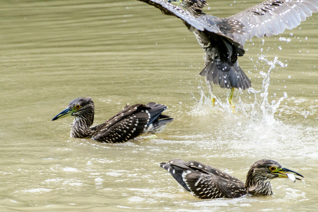 只等喂食人一声呼喊召唤,便齐刷刷地俯冲到水面,一头扎入水中,争食用弹弓弹射出的小鱼,水花四溅,迅猛异常。