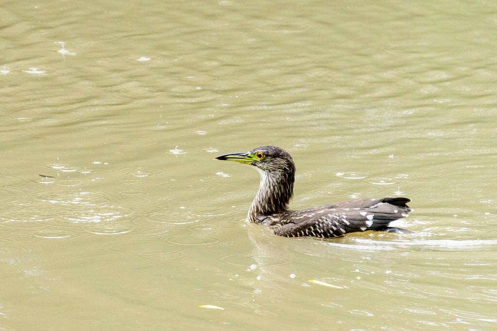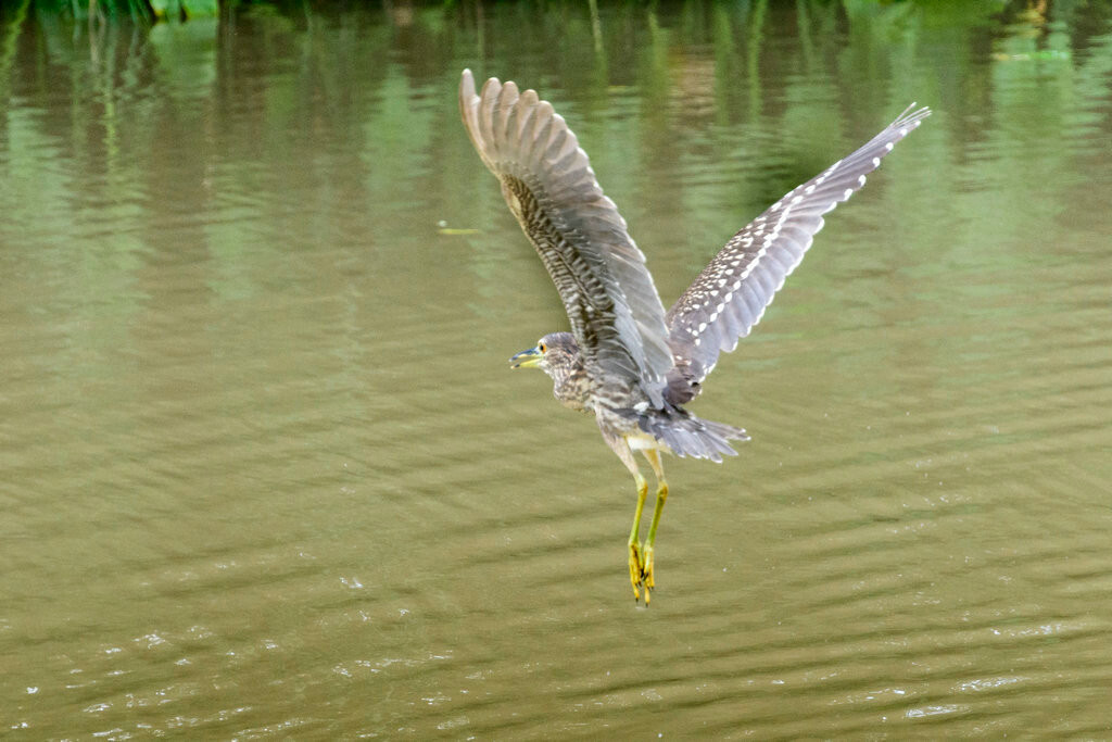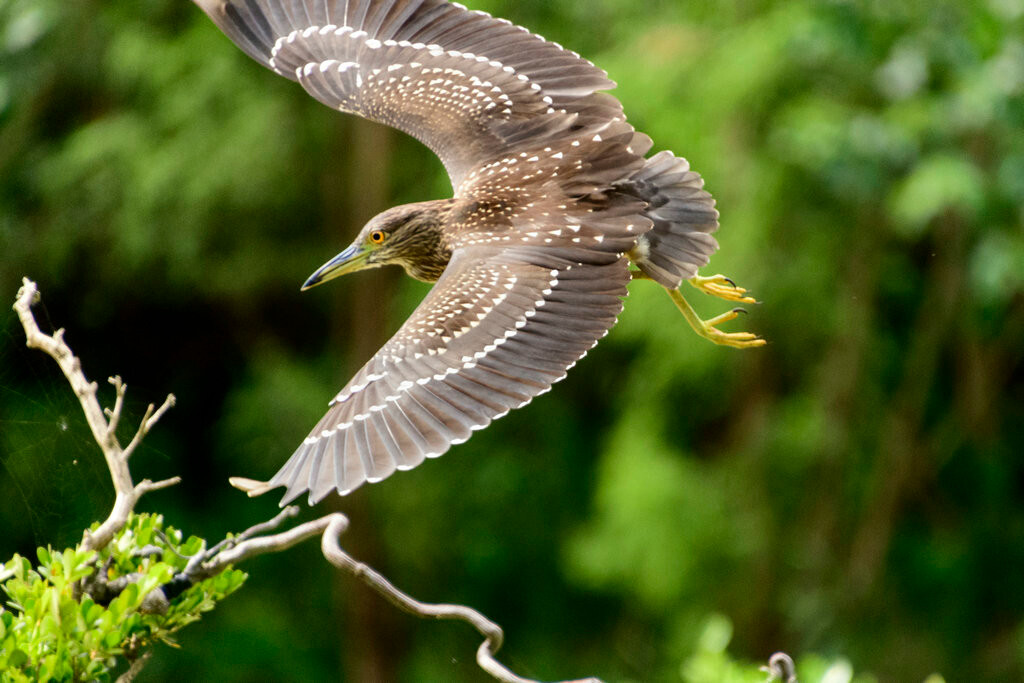 幼鸟上体暗褐色,缀有淡棕色羽干纹和白色或棕白色星状端斑。下体白色而满缀以暗褐色细纵纹,尾下覆羽棕白色。虹膜血红色,嘴黑色,眼先裸露部分黄绿色,胫裸出部、跗蹠和趾角黄色。幼鸟嘴先端黑色,基部黄绿色,虹膜红色,眼先绿色,脚黄色。