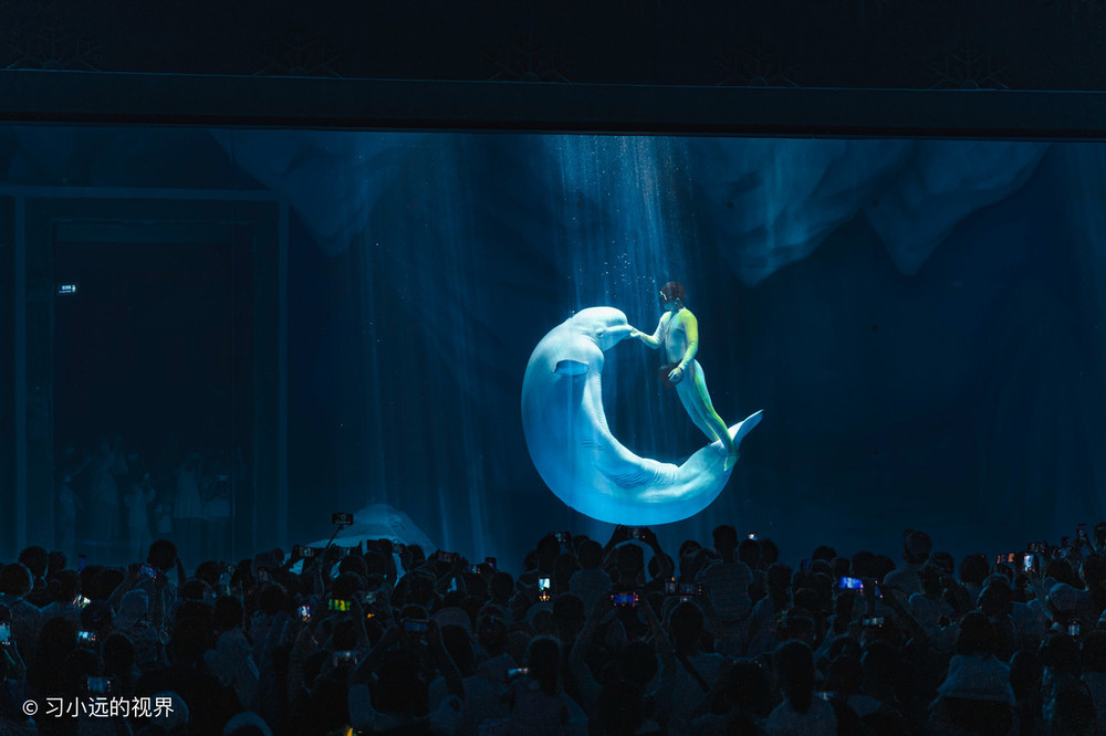 海豚剧场是科技情景交互设计的,结合了声、光、电、水幕等等高科技设备,再加上海豚和演员的融入,给游客一场浸入式的体验。老实说,海豚和人能配合的这么好,确实感觉很吃惊,人类驯兽师和海洋生物都这么有默契的同场演出,真的不可思议。这里面的表演到现在写游记记录时还是印象深刻,比如人和海豚在水中共舞的场景,还有就是几只海豚跃出水面的优美动作都不禁让人向往。