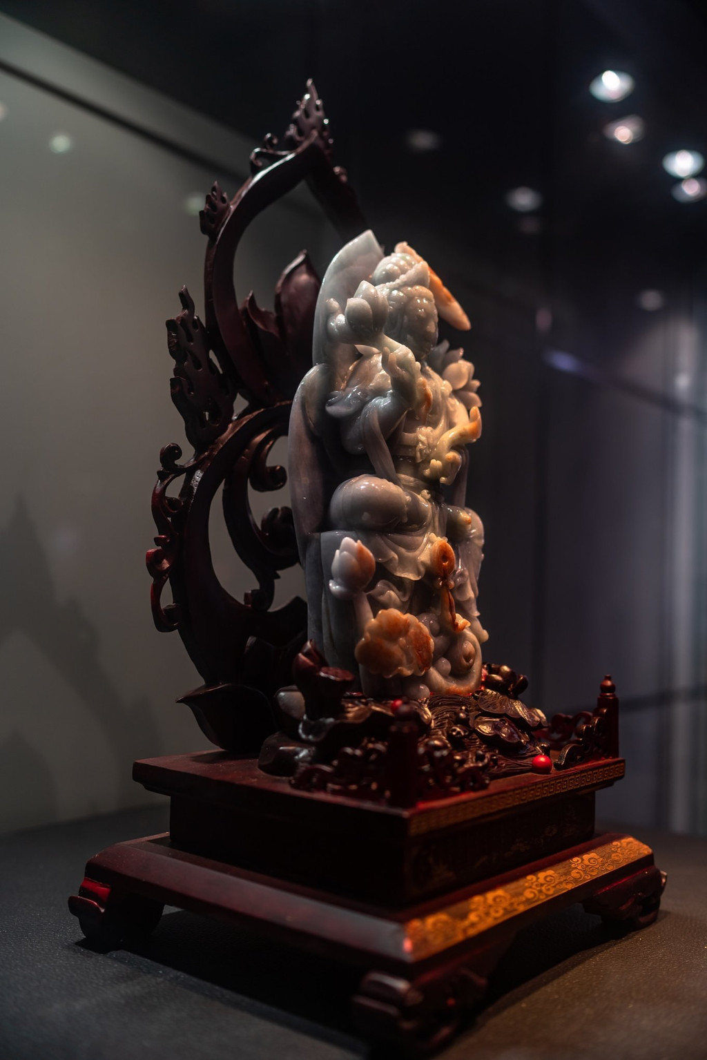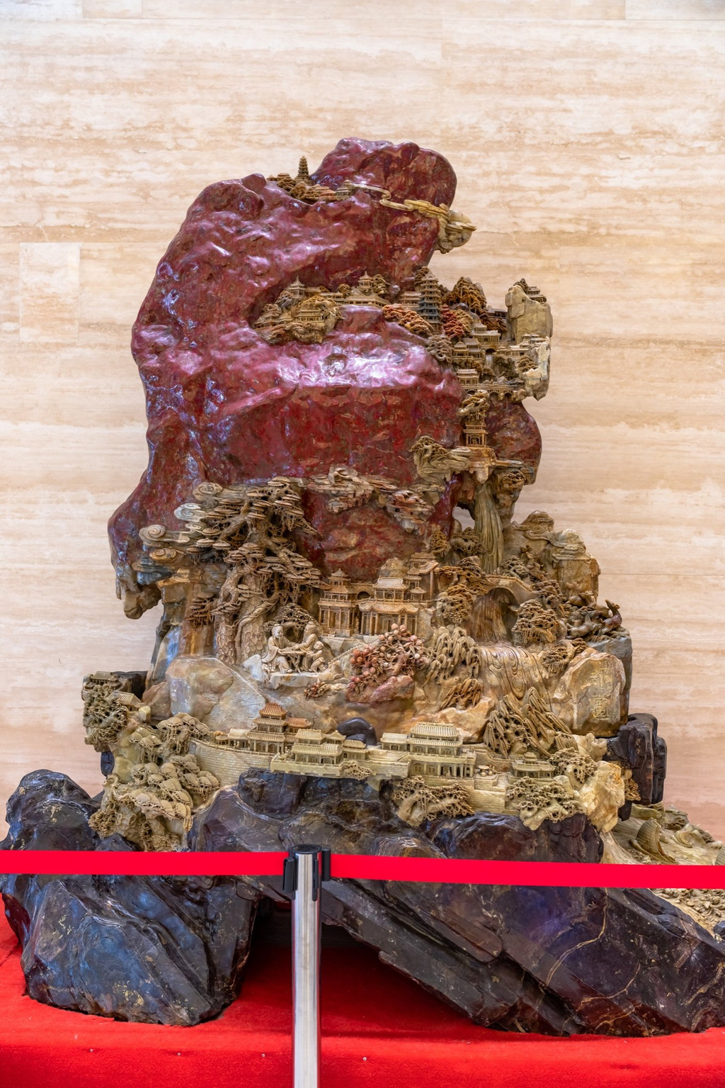 步入博物馆,除了整面墙壁的巨大荧幕,将你带往茶园山野,还有大厅之侧的玉石山子,吸引眼球。一块自然蕴育的石料,如何在艺术大师巧手妙心之下,通过色彩、纹路、质地的不同层次,将自然之内通过人手,呈现在这玉石之上。