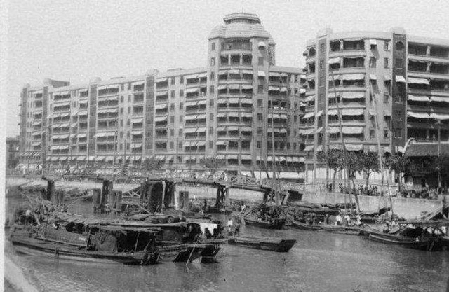 上海总商会的马路对面,就是鼎鼎大名的河滨大楼。这栋占地7000平方米的“∽”形大厦,由当时上海地产第一大户--沙逊洋行建造。是当时上海单体建筑总面积最大的公寓住宅楼,时称“远东第一公寓”。整栋建筑可以住700多户,2000多人,底层还有个游泳池。