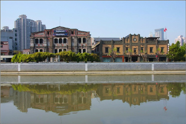 想走完全程的,可以继续沿着苏州河岸的散步道往东,这一段绿化做的不错。大约800米左右,过了西藏路桥,会看到一座巨大的灰色英式老仓库,这就是衍庆里了。