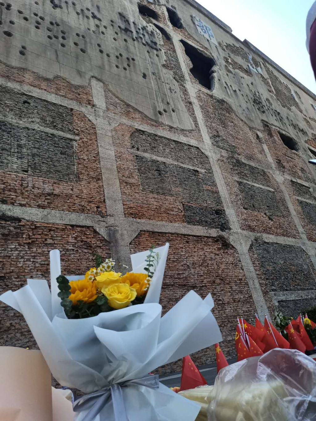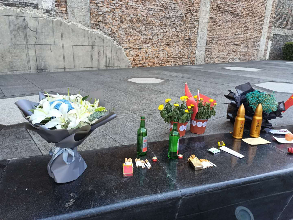 在弹痕累累的墙壁下有一条黑色大理石祭台。祭台上放满了各色祭品,都是来参观凭吊的人们放置的。祭品有鲜花有国旗,有香烟有烈酒,有糕点有饮料。人们根据自己的理解,用自己的方式,摆放各色祭品,缅怀祭奠远去的抗日英灵,表示对先烈的仰慕和崇敬。