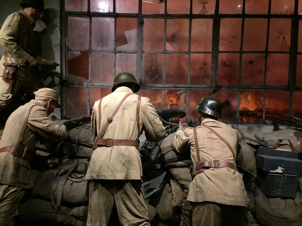 仓库内的展区布置成当年抗击日寇时的战斗场景,有图片有实物详细介绍了四行仓库战斗的前因后果以及八百壮士抗击日寇的经过。展厅里有很多八百壮士坚守阵地的雕塑,让参观者有身临其境的感受。