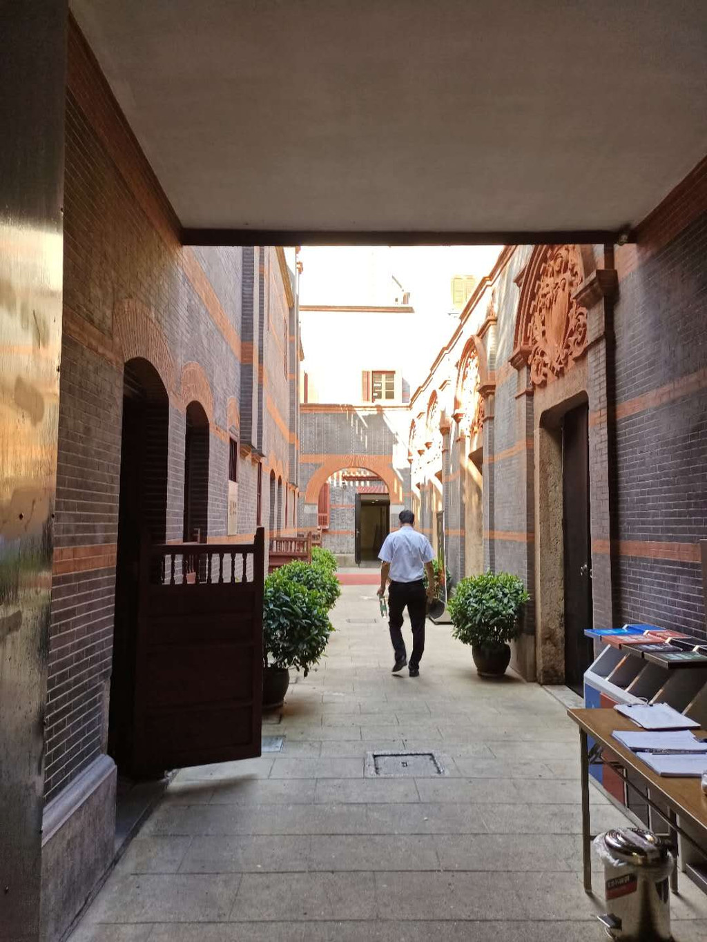 100年前这里是法租界,归法国人管辖,行道树都栽种法国人喜欢的法国梧桐。距离这里不远处的复兴公园曾经是当年法国人聚集游乐的地方,如今那座花园的格局还遗留着许多法国风貌。兴业路两旁多为上海早期的民居——石库门房屋。这里的石库门房屋都经过了精心修缮,还原了房屋的本来风韵。房屋都不高,两三层。石头做门框,以乌漆实心厚木做门扇,青砖墙壁,黑色盖瓦。墙壁青砖之间的砖缝用白石灰填充,形成一条条笔直的白线。齐整的白线布满整座房屋的外墙,看上去赏心悦目。赏心悦目的石库门房屋与青枝绿叶的梧桐相映衬,整个街区给人以清新的感觉。