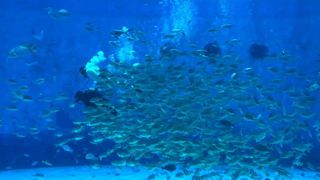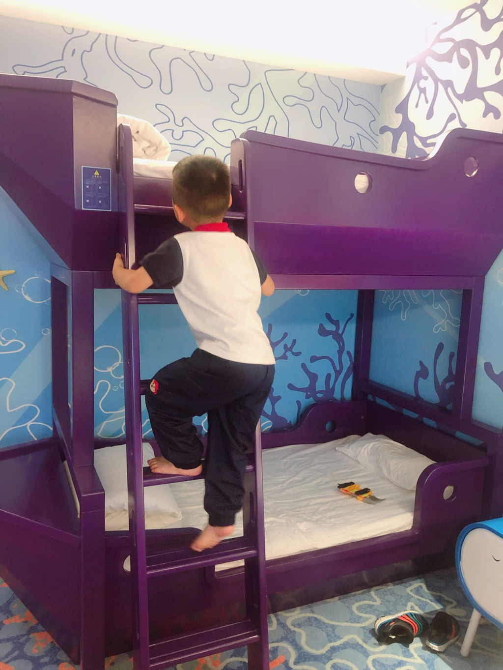 第三天我们早上睡到自然醒,因为海洋公园那边酒店也需要12点才能办理入园,所以时间上不赶,我把前两天的脏衣服整理出来,顺丰快递回家,行李就轻松多了,9:30从酒店出发,路程2小时到海洋公园,办理入住登记,在酒店吃好午饭后,我们就入园了,因为是周日到的,刚好又赶上上海旅游节,人真的超多,过山车需要排队2小时,缆车排队1小时,所有表演羡慕都至少要提前40分钟去排队,跟我们第二天周一入园形成非常大的反差,周一所有项目几乎都不用排队,阳阳爸坐过山车都只排了5分钟。去了园区后一定要关注海昌海洋公园的公众号,里面会有最新的表演时间,以及每个项目的排队时间,但是此处我又有失误一次,我以为周日和周一的表演场次是一样的,所以周日只看了一场虎鲸表演,就去排队坐缆车了,其实应该周日尽可能的多看表演,因为周日表演多,周一全部安排在下午,最早是12点开始,但我们13:30是要返程的,所以第二天只能看一场演出,相反那些娱乐设施都是在的,是全天开放的,所以两天下来我们只看了虎鲸和人鱼两场表演,有点可惜了。其余整个过程都是非常愉快的,房间有小朋友的上下铺,阳阳晚上强烈要求自己一个人睡在上铺,我和他爸爸也担心了一个晚上,害怕掉下来。晚上周末到20:30闭馆,平日是到20:00,早上酒店住客可以8:30就入园,我们第二天进去的时候企鹅馆都没有人,非常空旷。