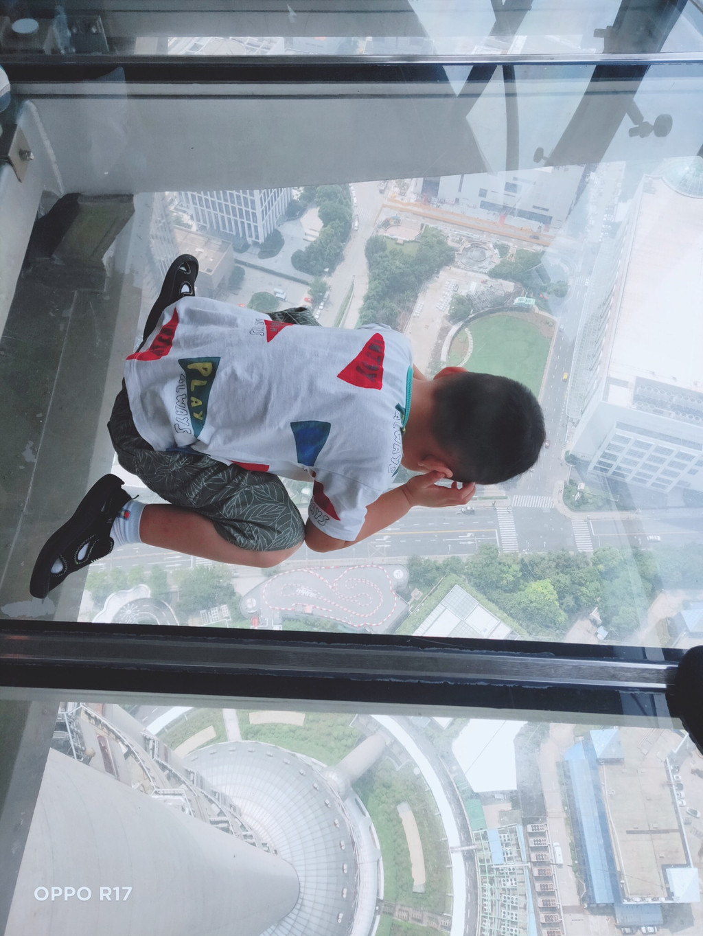虽然第一天住宿非常不愉快,但第二天一早,我们兴致勃勃出发东方明珠塔,地铁2号线很快就到了,上午10:00到达,排队安检用了差不多10分钟的时间,但进去之后就可以通过快速通道直接坐电梯到263米的主观光层,俯瞰浦江两岸风景,走楼梯往下一层就是全透明悬空观光廊,全球唯一的360度全透明玻璃观光廊,大人走在上面有点心慌,小朋友却是一点都不怕,还从上面看到了地面1楼的卡丁车馆,嚷着等下要去。