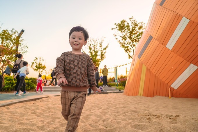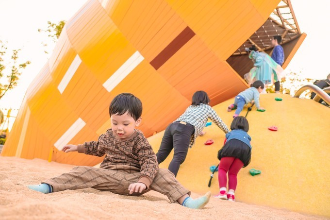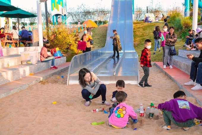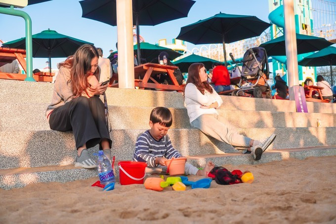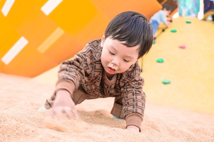 从滑梯下来,便是一大片沙子,孩子们在这里玩乐,父母在一旁陪伴,孩子们的欢乐总是那么简单,一片沙子就可以玩上一整个上午。