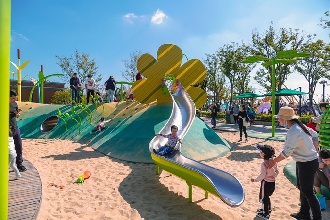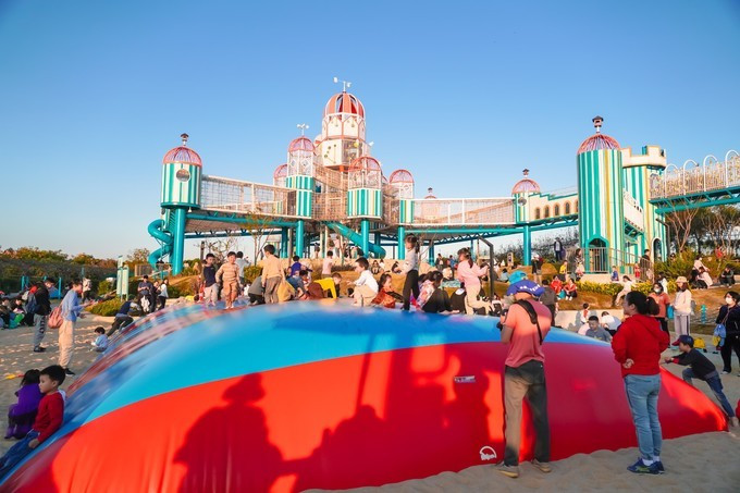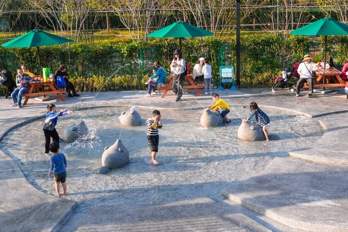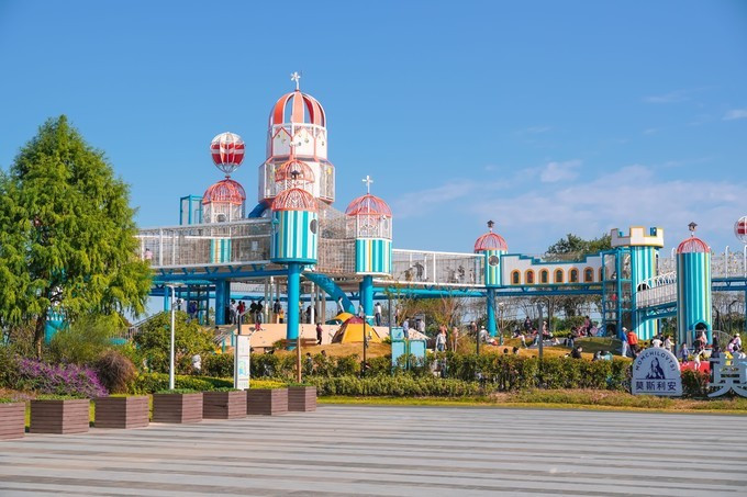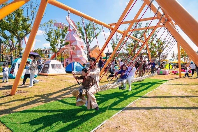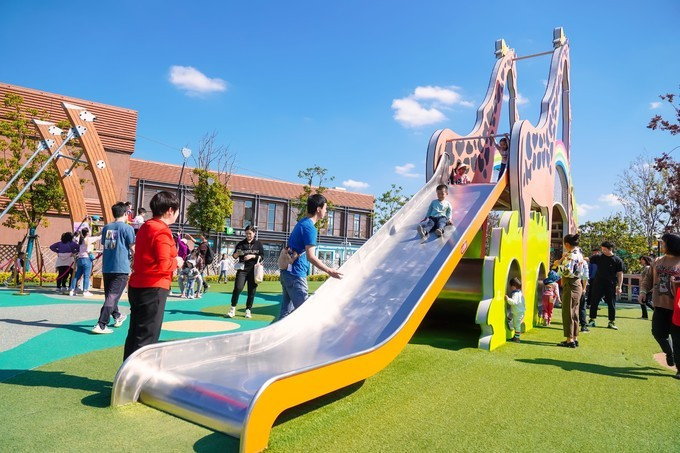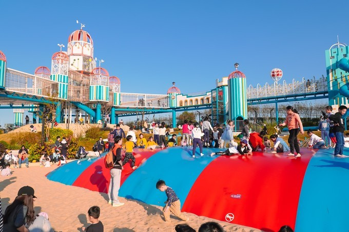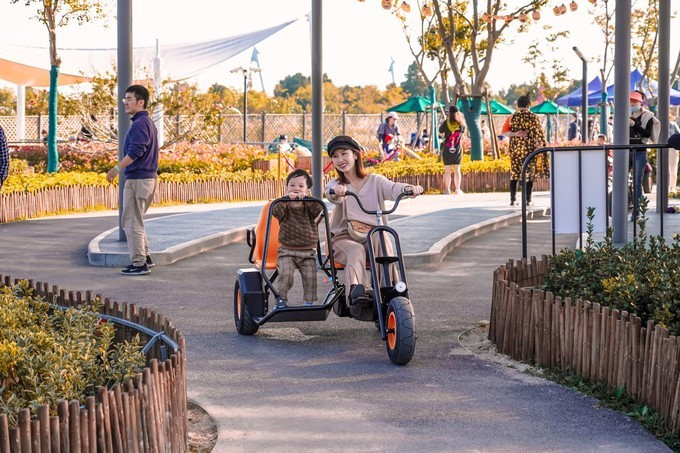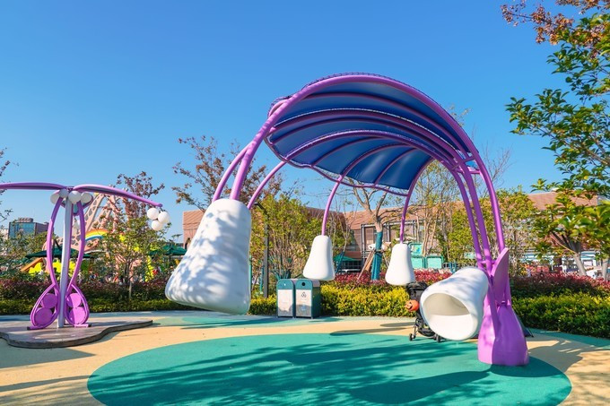 有别于普通的公园,这里的大草坪除了可以野餐外,还有各种秋千、网红针雕等玩具,家长可以一边休息,晒着和煦的阳光,一边陪着孩子玩乐。