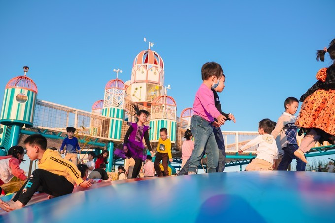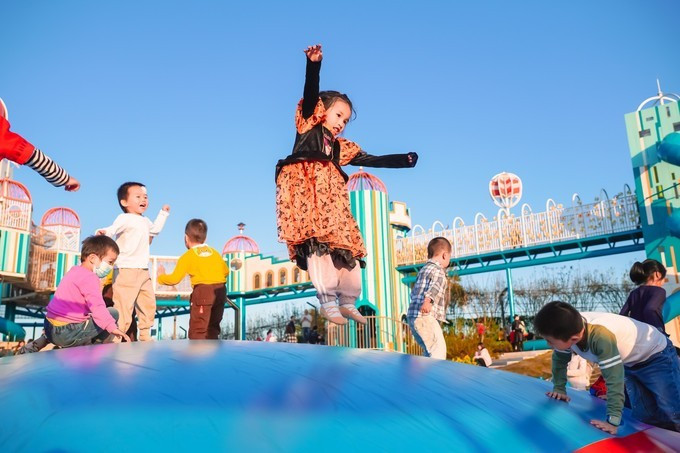 在城堡旁边,正有一群孩子们在蹦蹦跳跳的,这就是捕梦网区域,这里的弹跳床面积超大,可容纳许多小朋友一起在上面尽情弹跳。