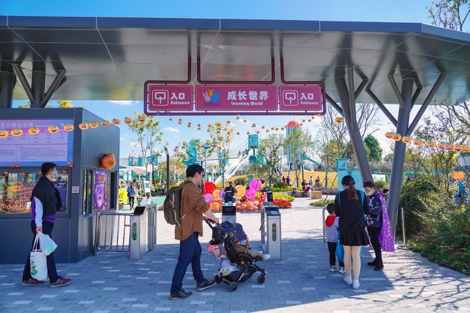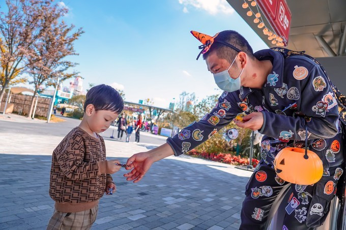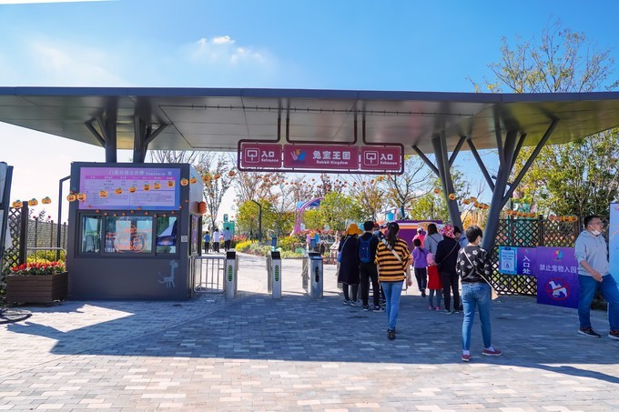 从成长世界出来,对面便是兔宝王国,入口处穿着万圣节服装的工作人员,正在给进入的小朋友们派发糖果。