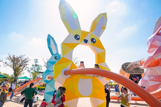 兔宝王国里最显眼的,就是在兔宝堡区域里的那几只网红兔子了,马卡龙色的兔子城堡造型充满着童话感,下是细软的沙子,孩子在兔子里面穿梭,还能从大大的胡萝卜里滑下来,太有爱了。