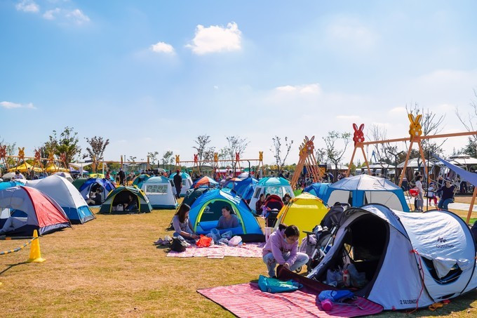 园区内哪个区域人群最集中?那一定是魔音谷,网红兔旁的大草坪。带帐篷来的家庭,一进园就开始在草坪上搭起自己的小屋了。