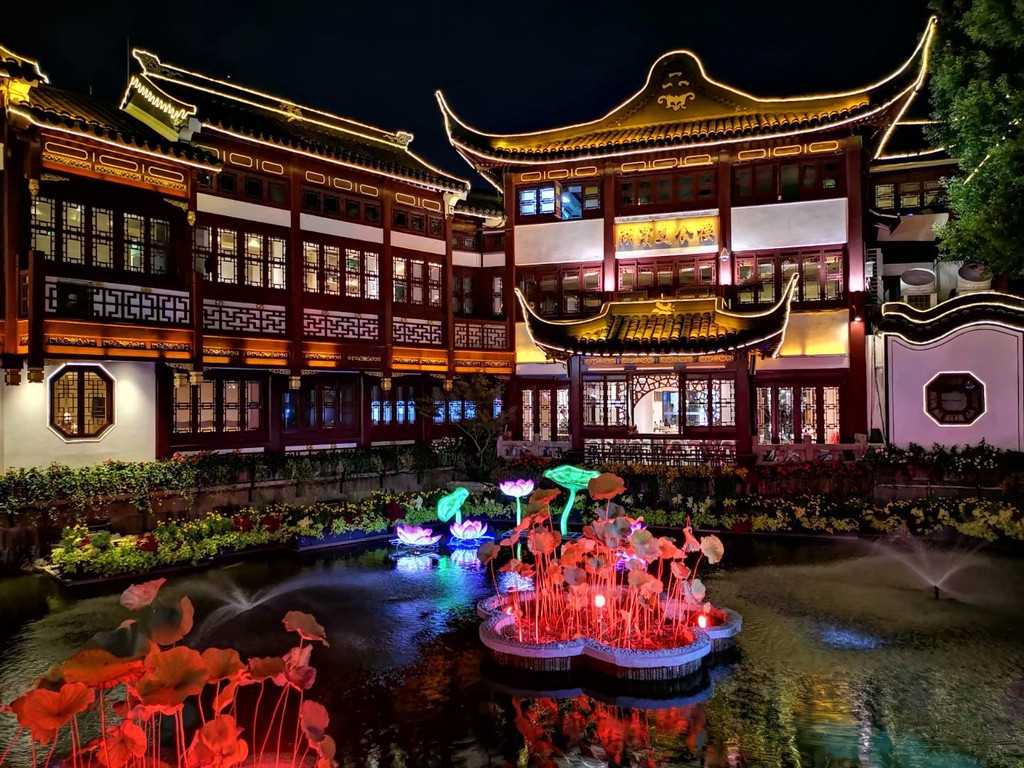 城隍庙的夜景可谓金碧辉煌,堪称皇家气派,所有的灯饰只为证明它的伟岸和雄姿。