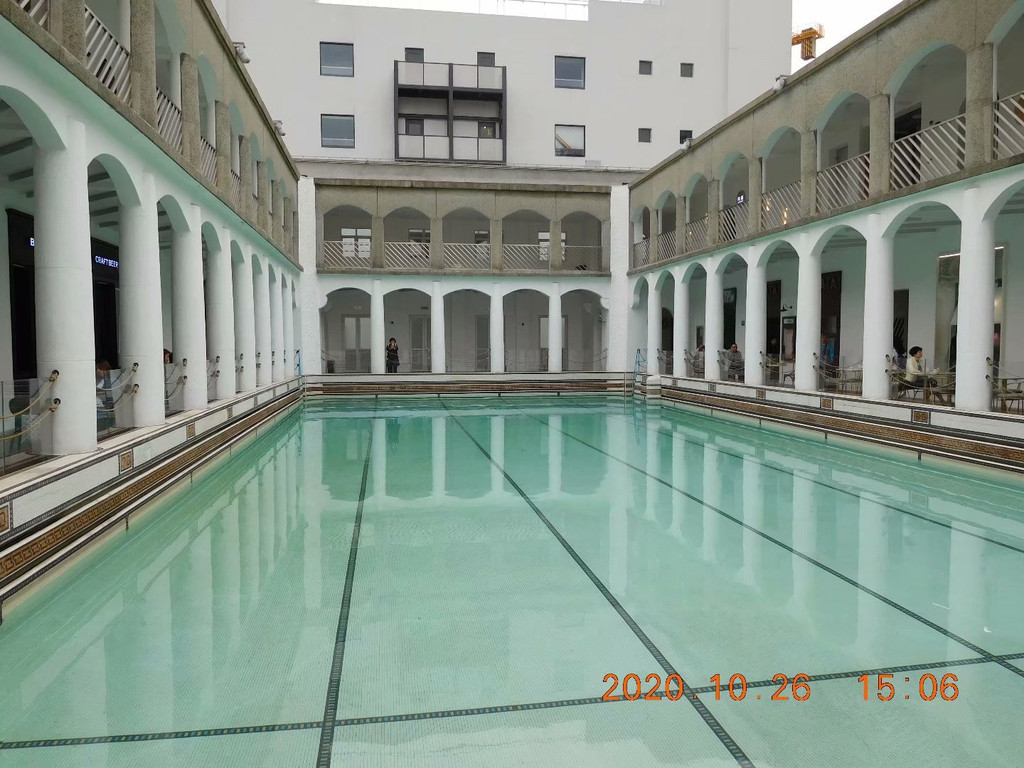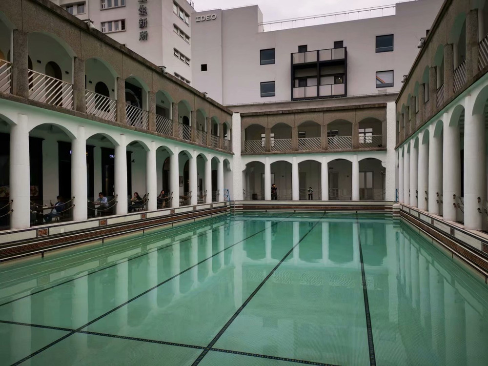 这是上海唯一还保留着英制尺寸的游泳池,本来是海军俱乐部露天泳池,两旁的西班牙风格建筑,拱门和泳池相呼应,让人有些恍惚身在何处。
