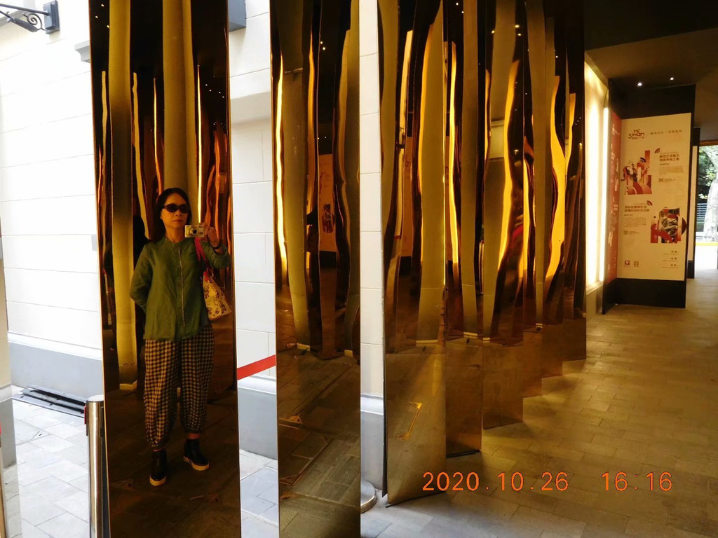 一条“时光弄堂”位于思南公馆中心的北部,北接复兴中路,南通思南公馆内部主街,是一条宽2-3米,长约30米的弄堂。在这个狭长的线性隧道中,穿起了思南的过去,现在和未来。此间,由26根的双向镜组成的镜面阵,连两面墙紧密排开。历史是一面多棱镜,能够折射出多彩的光芒。金色镜面的不锈钢材质在黑色背景的映衬下,与来访的游客互动,其中走动的参观者仿佛走在自己的26个叠影中,仿佛和不同时间中的无数个“我”一起在历史中行走。历史和当下,在此进行着有温度有厚度的对话。时光弄堂里有冯玉祥、梅兰芳、张学良……也有现在的我们。