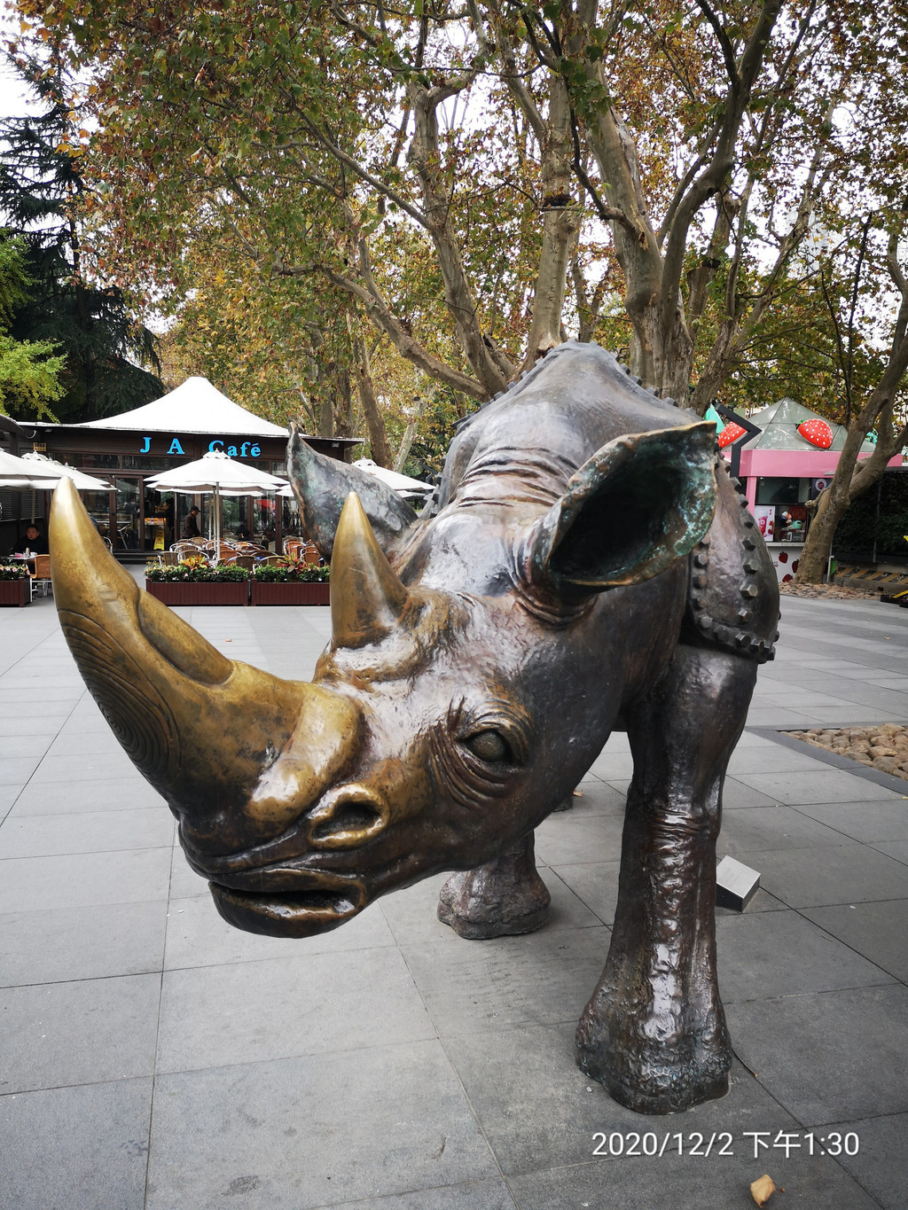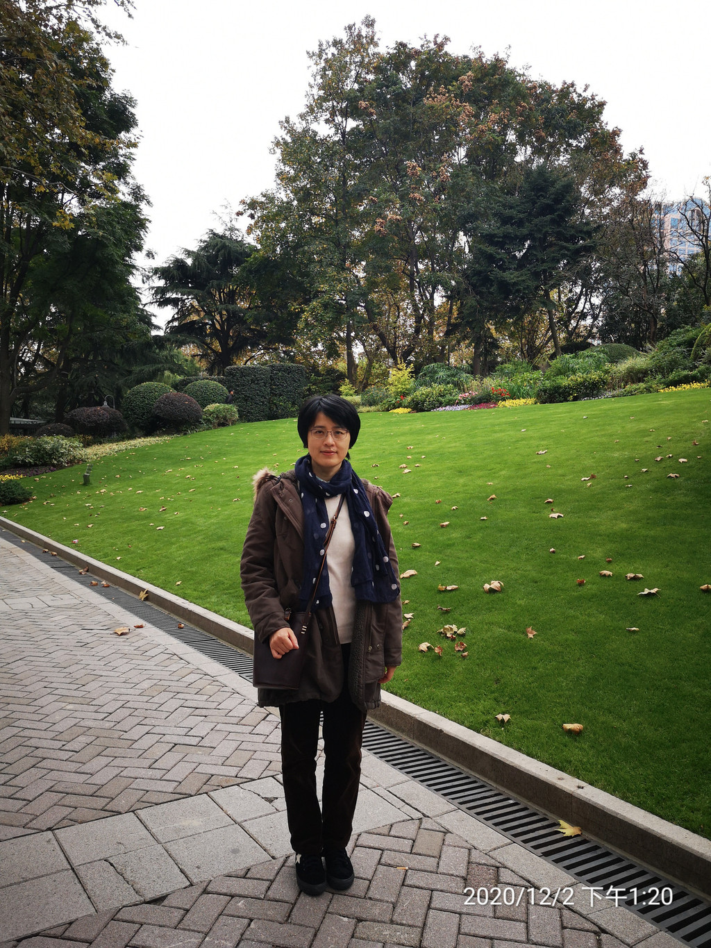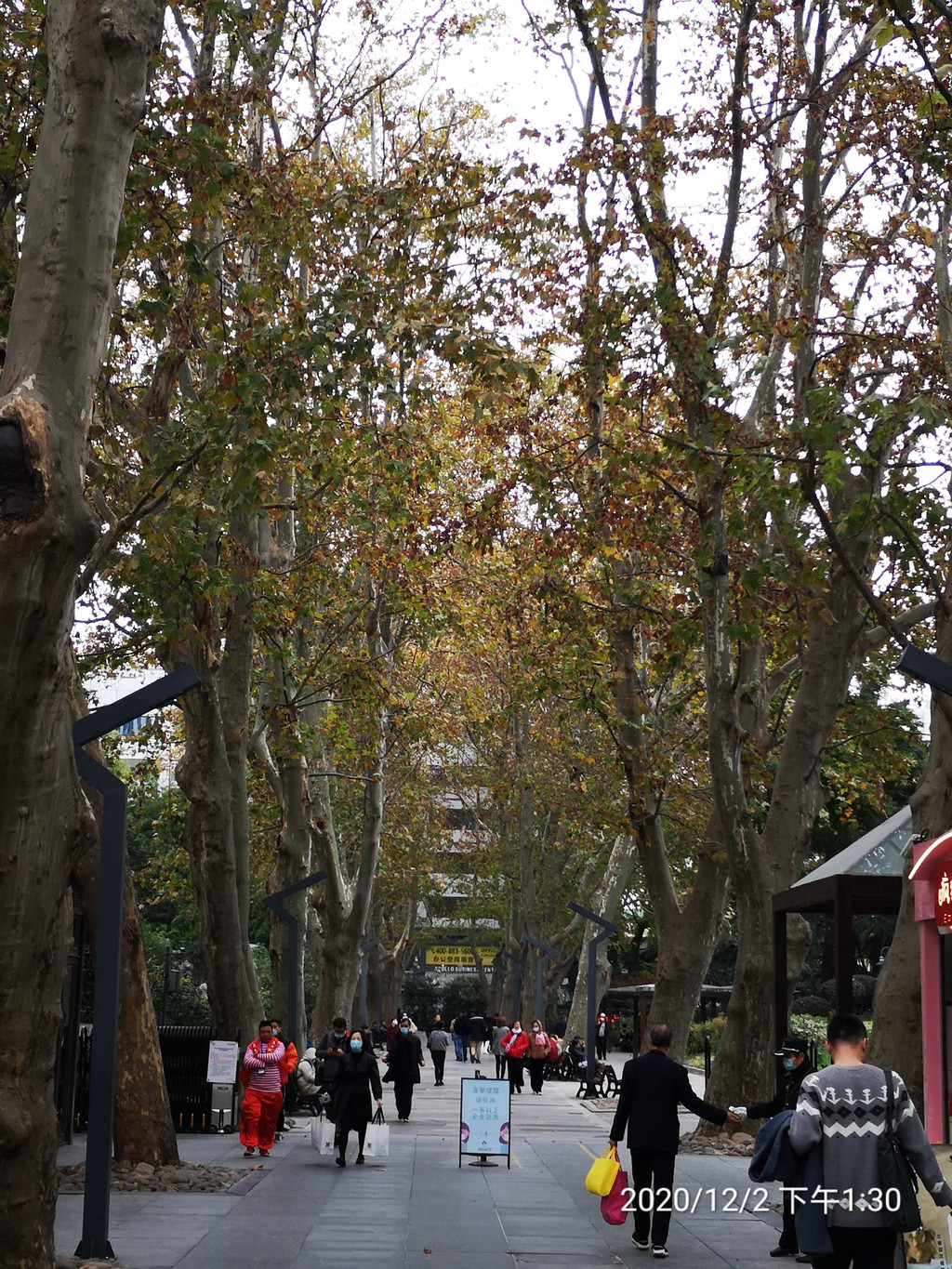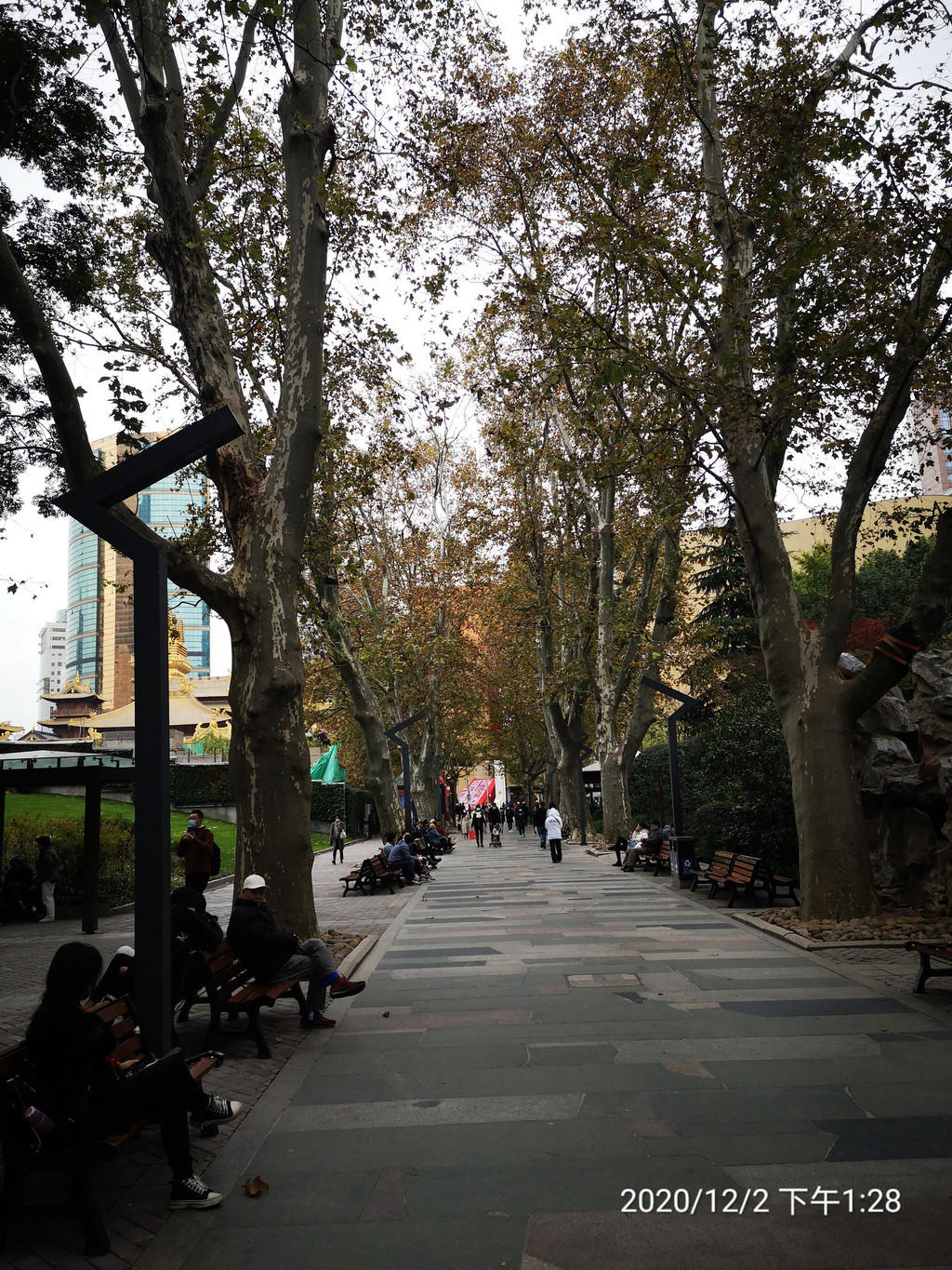 进入不久,右侧有一块大草坪,呈斜坡状。进入深秋,梧桐树叶,泛黄始落,草坪依旧绿茵茵的一片,仅仅注视草坪,以为时值春季呢!这一片绿茵茵,与静安寺内的一片金灿灿,构成了隔街的无声绝妙呼应!