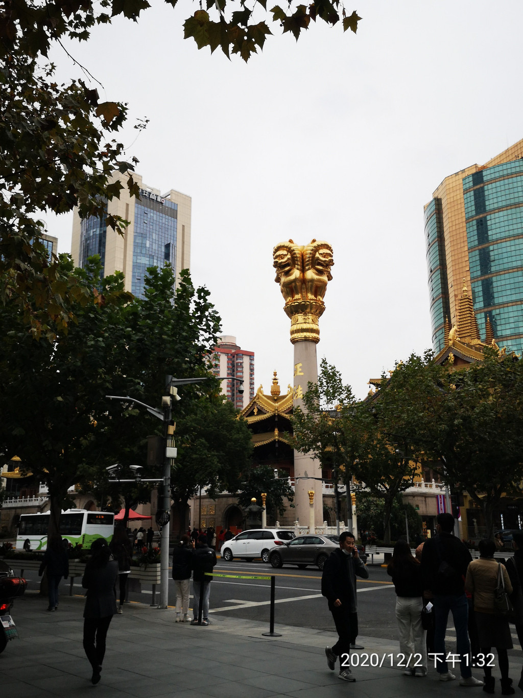 12月2日与女儿在上海市内办事,滴滴打车到静安寺,在寺北的人道素菜馆吃了斋面,再购票进入静安寺烧香,磕头,许愿。寺庙为四周高楼裹挟,门外车水马龙,如此景观的庙宇,大概是全国唯一吧。寺庙内让我能感觉到大自然存在的是大雄宝殿前后几株古银杏树金灿灿的树叶。