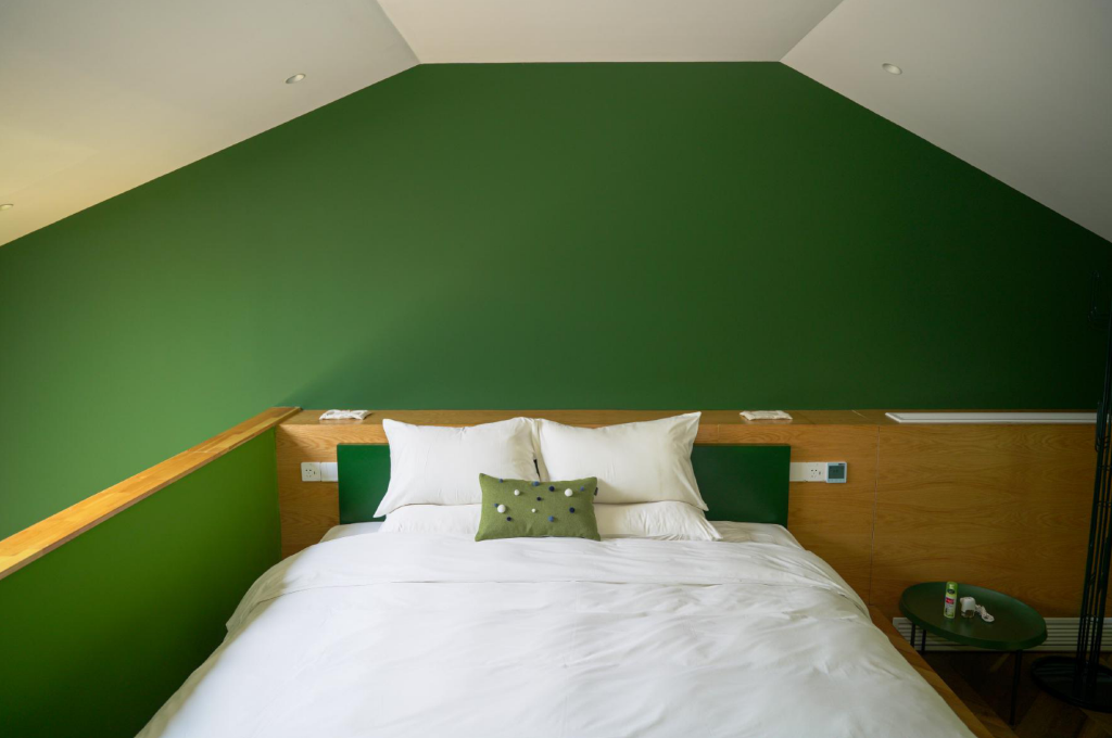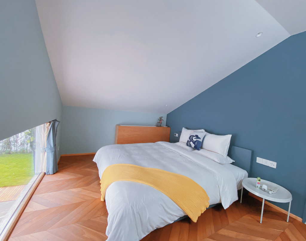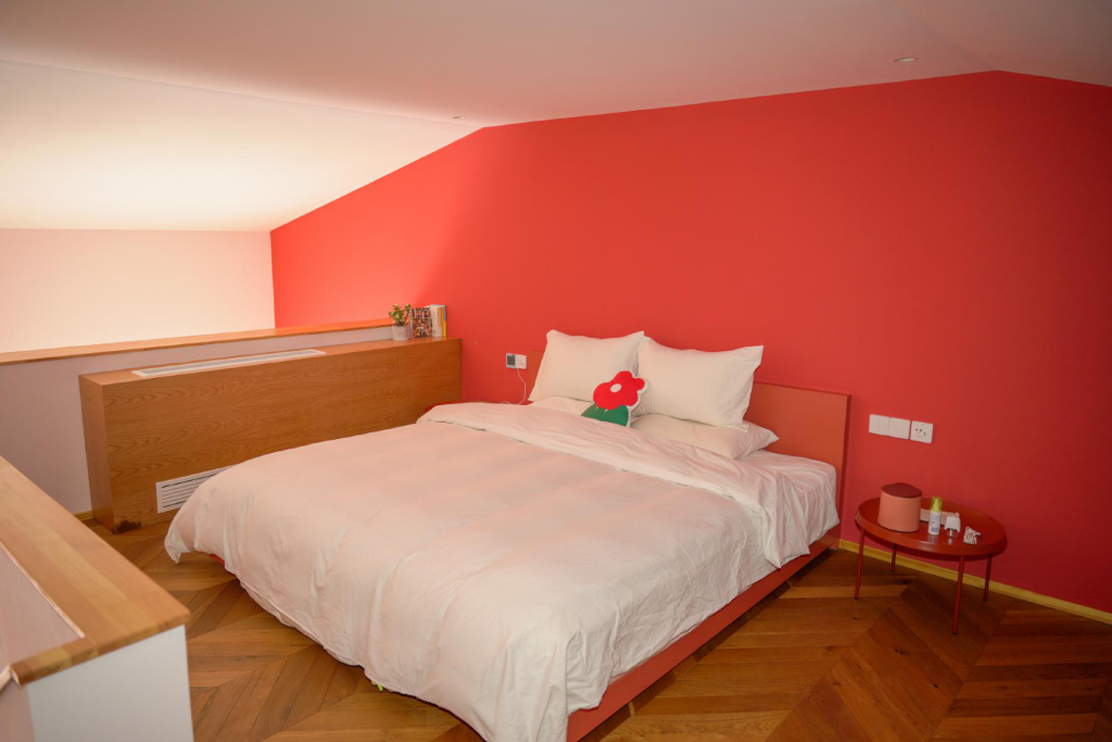 客房面积在30-50平米之间,小多层、夹层的设计让空间更有层次。建筑设计让居住空间明亮又开放,高饱和的色彩墙体创造出定格画面的艺术感,不刻意对称的轮廓,起伏错叠的间隙,让整个客房散发着未完结的故事气氛与感官沉浸,轻巧色块阵列使艺术表现力更显多元立体。当阳光从窗口、从上空漾起,一场恒久且无人知晓的时间位移在缓慢的丁格尔现象里,将眼前的一切变成艺术变成光阴,滋养著视觉和想像力。