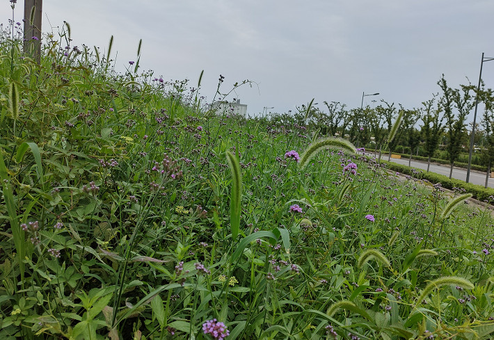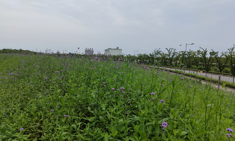 走出江滩,对面还没有完成建成,估计要建成度假村。矮矮的山坡上,是大片的马鞭草。如果再过两年,这里的花海就将成规模了。