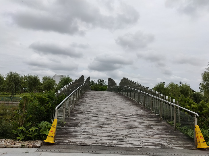 横架在北环河上的景观桥很现代化,又因为造型的缘故,很有艺术感。桥的两侧,就是滨水休闲广场。就广场本身的体量来说,也算不得太大。