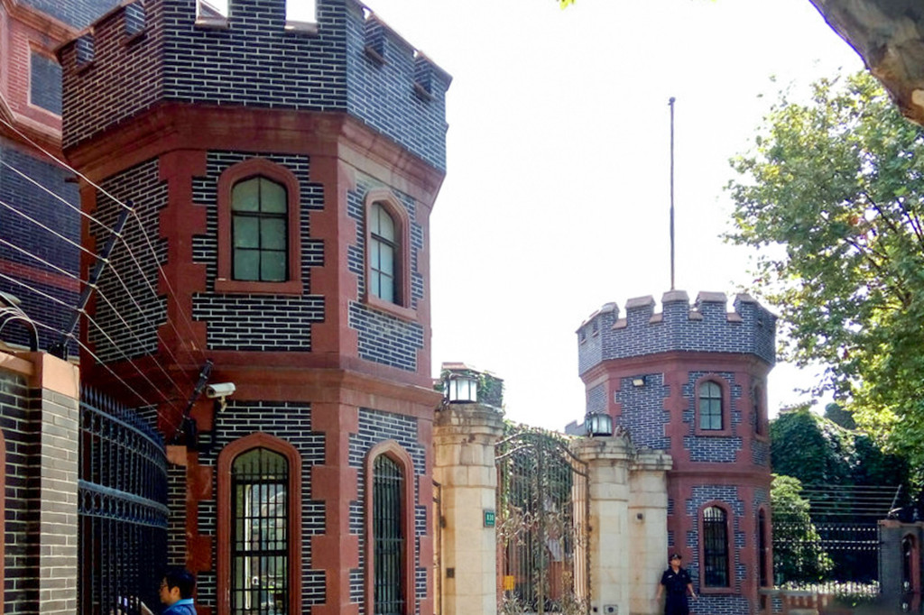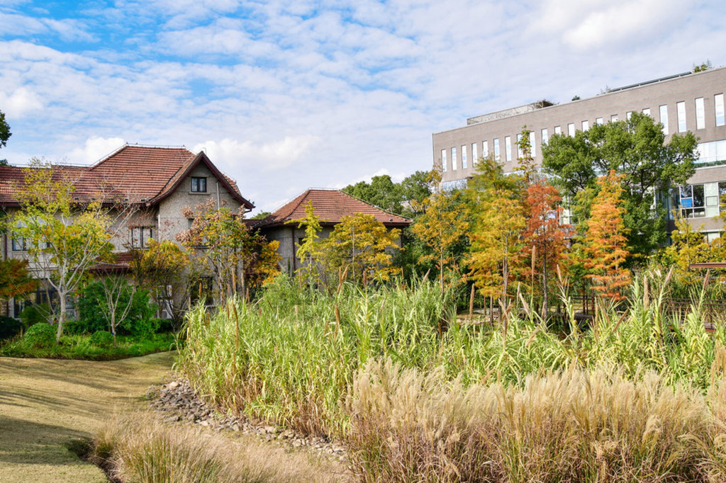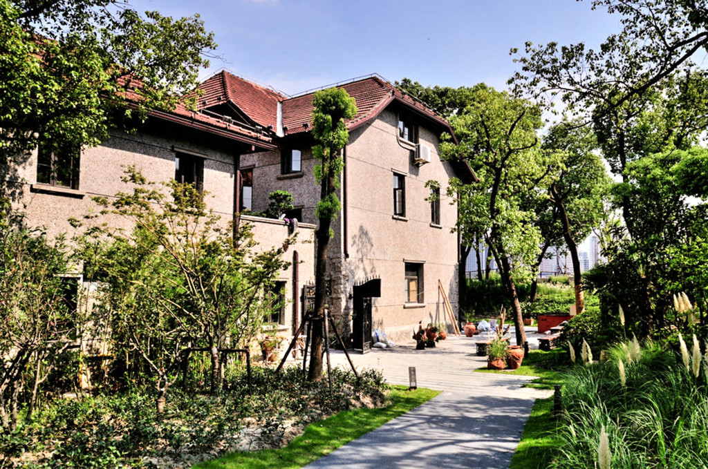 水潭中一座用钢管和网格板搭建起来的“九曲桥”蜿蜒其上,水潭边种着高大的水杉,而在水杉后,掩映在高大的香 樟树 下和浓密的竹林中的,是一座三层楼的小洋房。