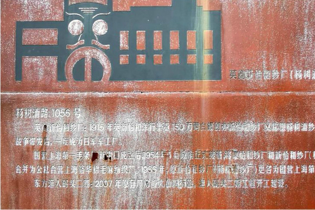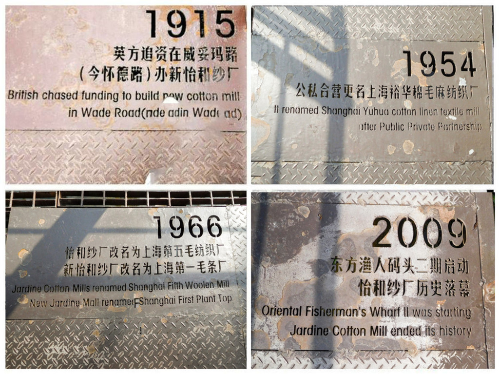 地面上刻印着怡和纱厂的前世前生。两家怡和纱厂当年均为英商怡和洋行开办:一是 上海杨浦 区杨树浦路1056号,近怀德路,是原新怡和纱厂旧址(又名为杨树浦纱厂、“ 上海 第一毛条厂”),最早是怡和洋行在1915年集资150万两 白银 创办的“英商新怡和纱厂”
