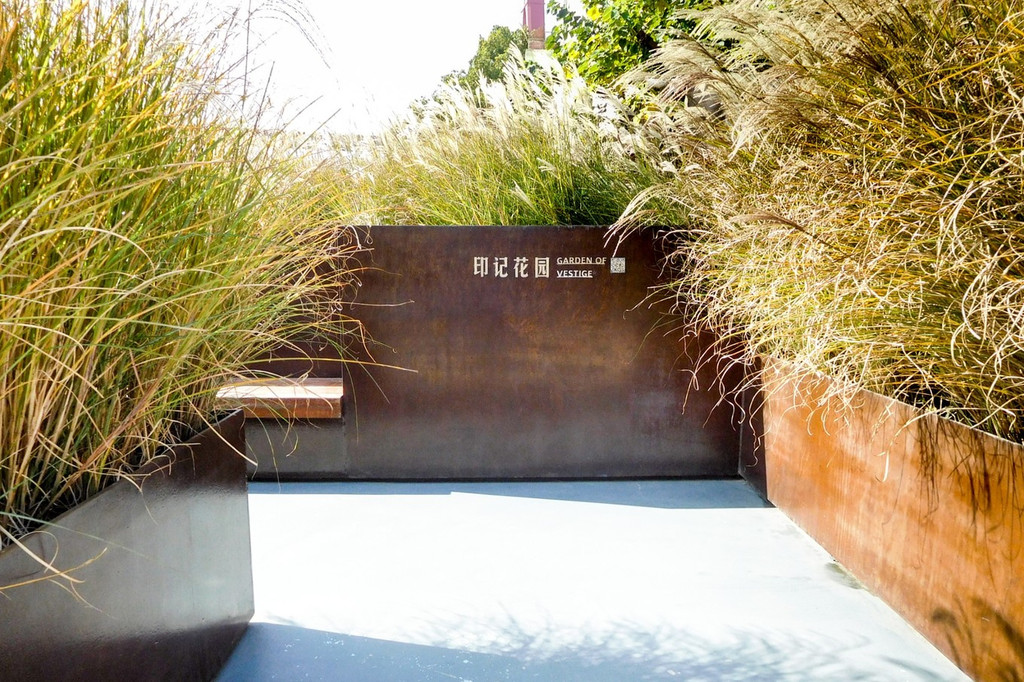 印记花园为国棉九厂沿江部分原址。通过历史考证再现了厂区场地肌理和空间格局,保留了原厂现存的独具历史风貌的厂房2座,并选取原厂区内特征明显的仓库、车间等用房遗址,转化为富于当代体验氛围的主题性印记花园等景点。印记花园依照原厂房仓库遗址的轮廓,在新生场地中印刻而出,或临于江边,或嵌入绿地。
