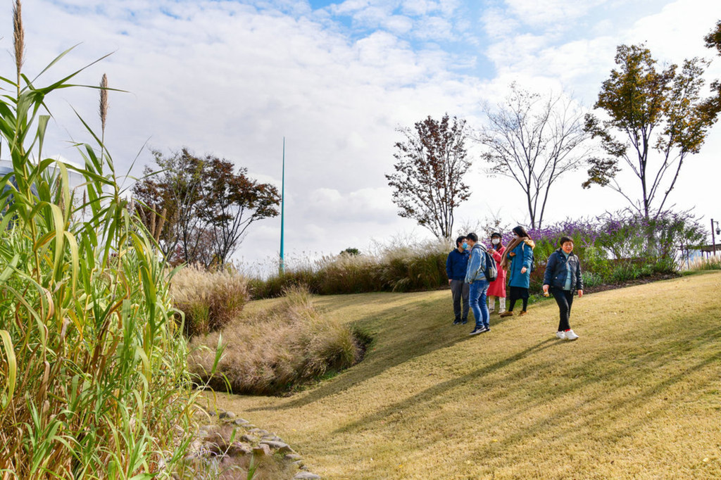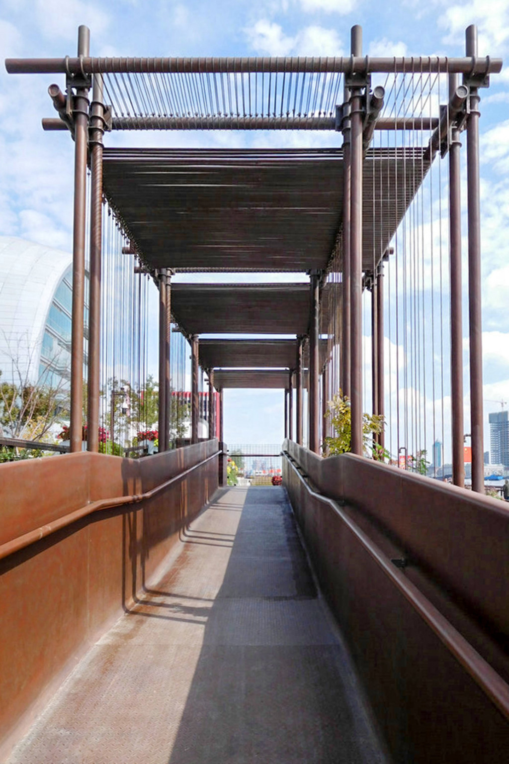 沿着露天的扶梯拾阶而上可登绿之丘。裸露的钢筋混凝土的框架,从二层起逐层收缩形成层层叠叠的露台。中央建有螺旋式扶梯,连通着各层的展厅,直达楼顶花园。站在屋顶花园遥望 杨浦 大桥及周边景色